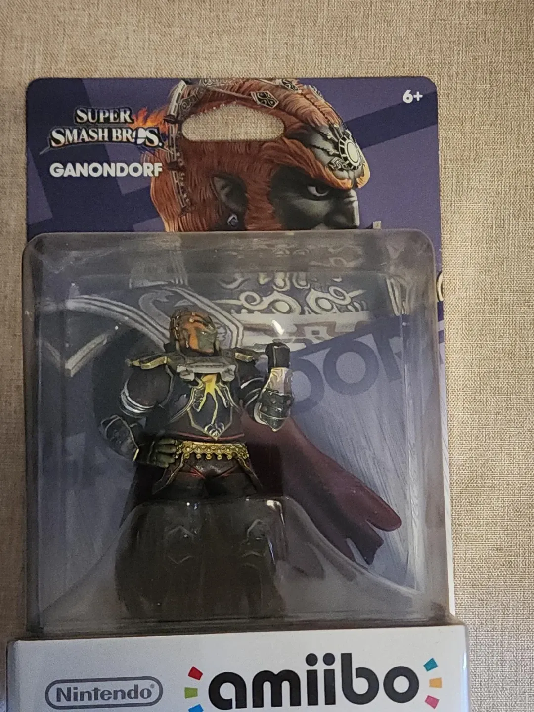 This is a Nintendo Amiibo figure featuring Ganondorf from Super Smash Bros. It's in its original packaging. Recommended for ages 6+.