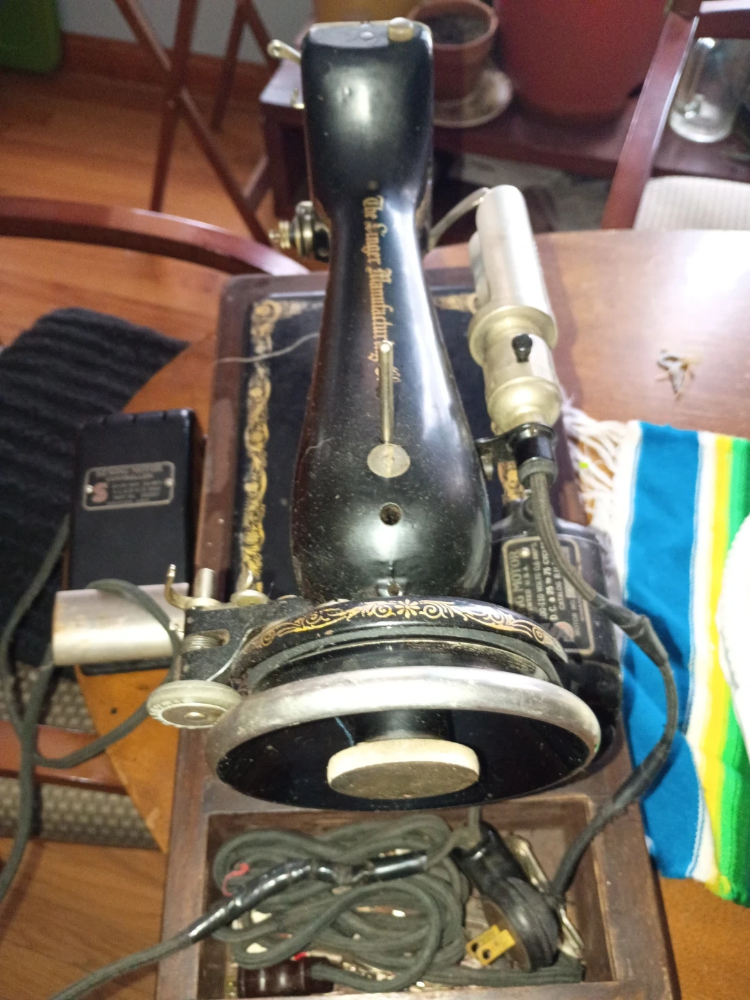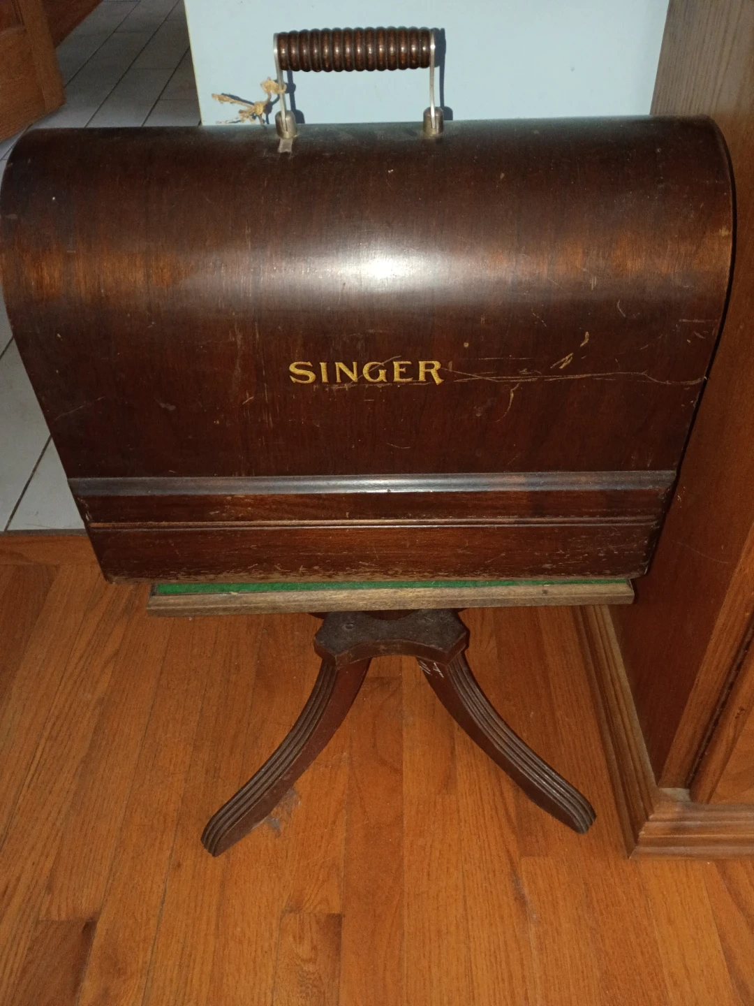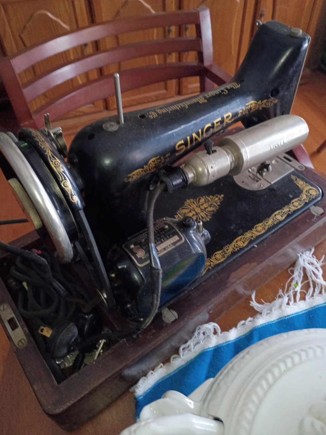 This is a vintage Singer sewing machine with a wooden case. It includes the sewing machine, a foot pedal, and a power cord. It's a classic piece for collectors or for use! It works perfect and the graphics are in great condition