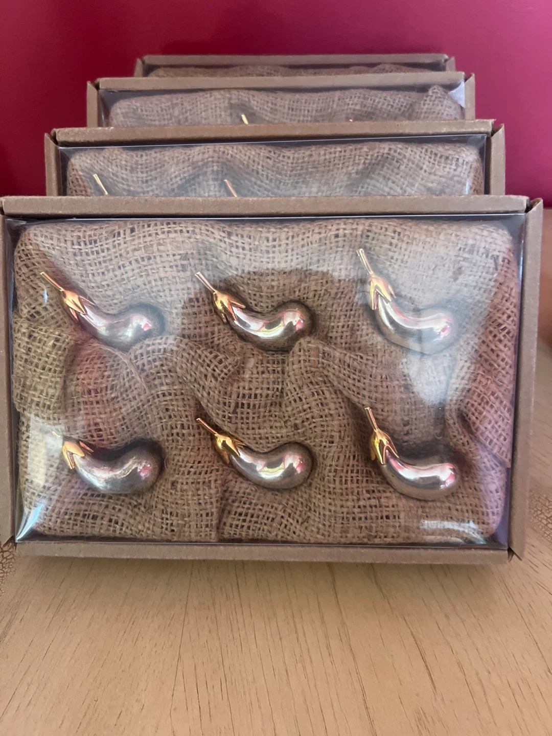 Each box includes vintage silver-plated and gold-accented eggplant-shaped knife rests. They're made of shiny silver-toned metal with gold accents. Have 4 boxes of 6. Each set $15