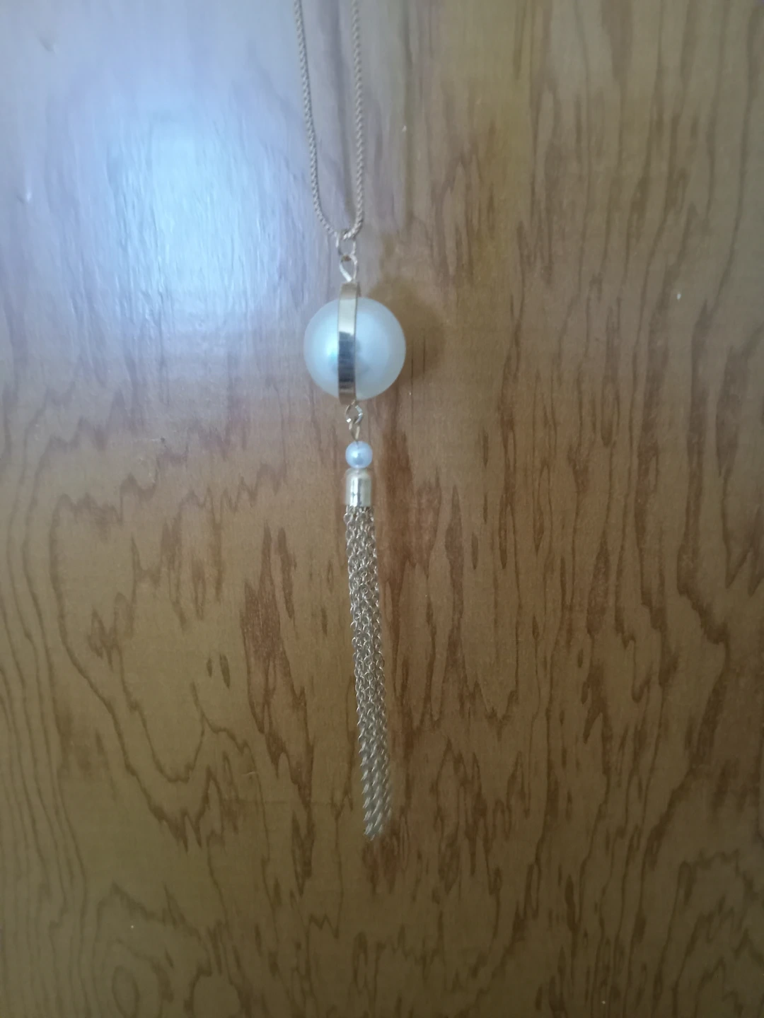 This gold-tone necklace features a large pearl pendant surrounded by a gold ring. It's accented with a smaller pearl and a delicate tassel. Chain length is adjustable.