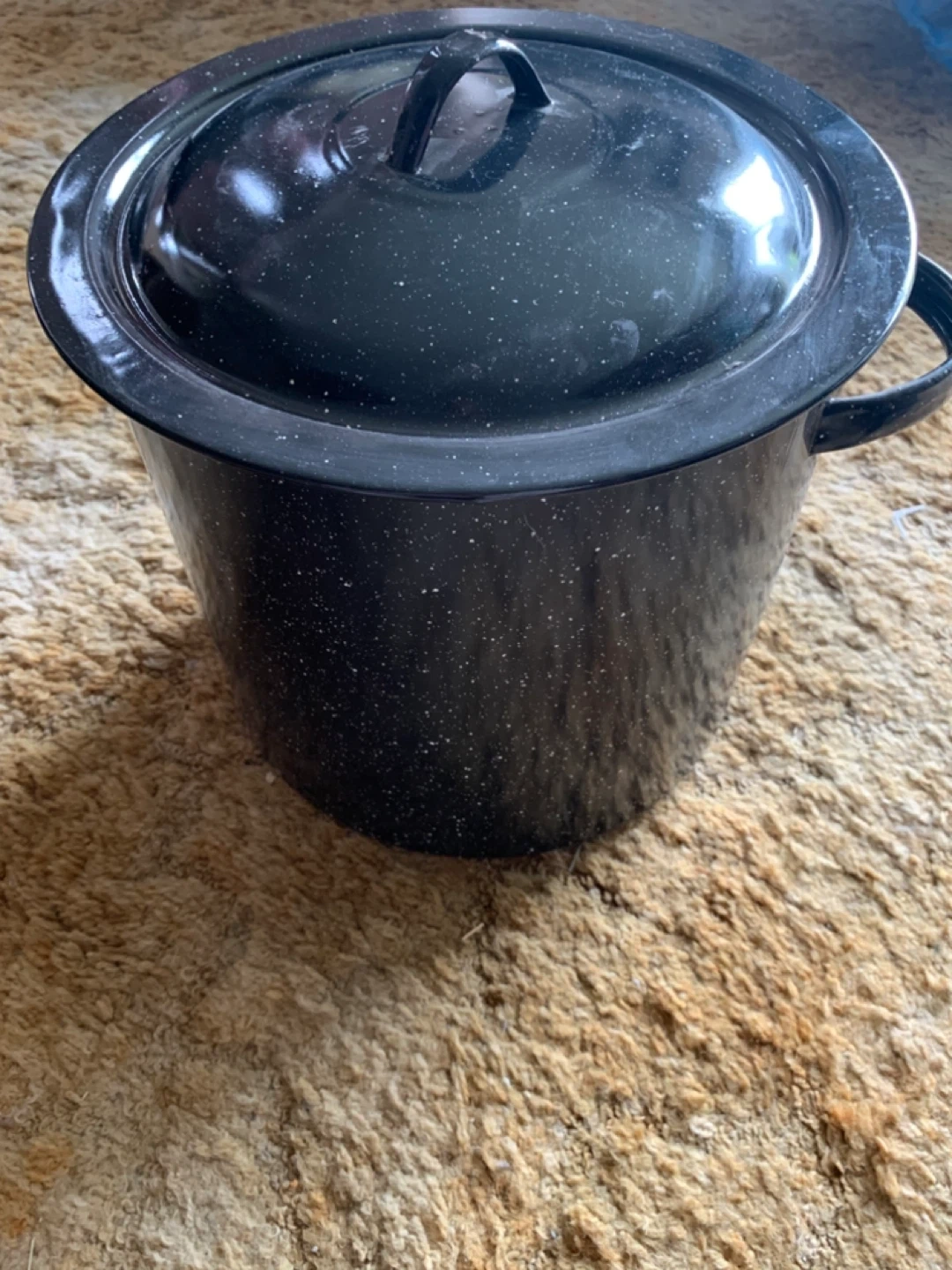 Black speckled enamel pot with a lid. It measures approximately 11 inches in diameter and 9 inches tall. This pot is made of enamel. Good for a stockpot or canning pot.