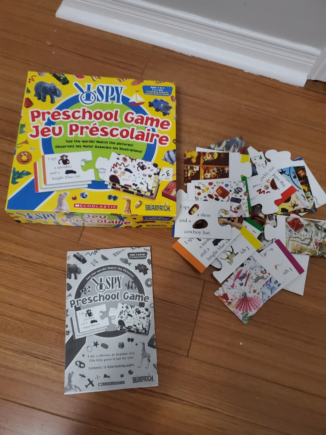This I SPY Preschool Game by Scholastic and Briarpatch is for ages 3 and up, with no reading required. It contains 12 interlocking pairs. See the words and match the pictures!