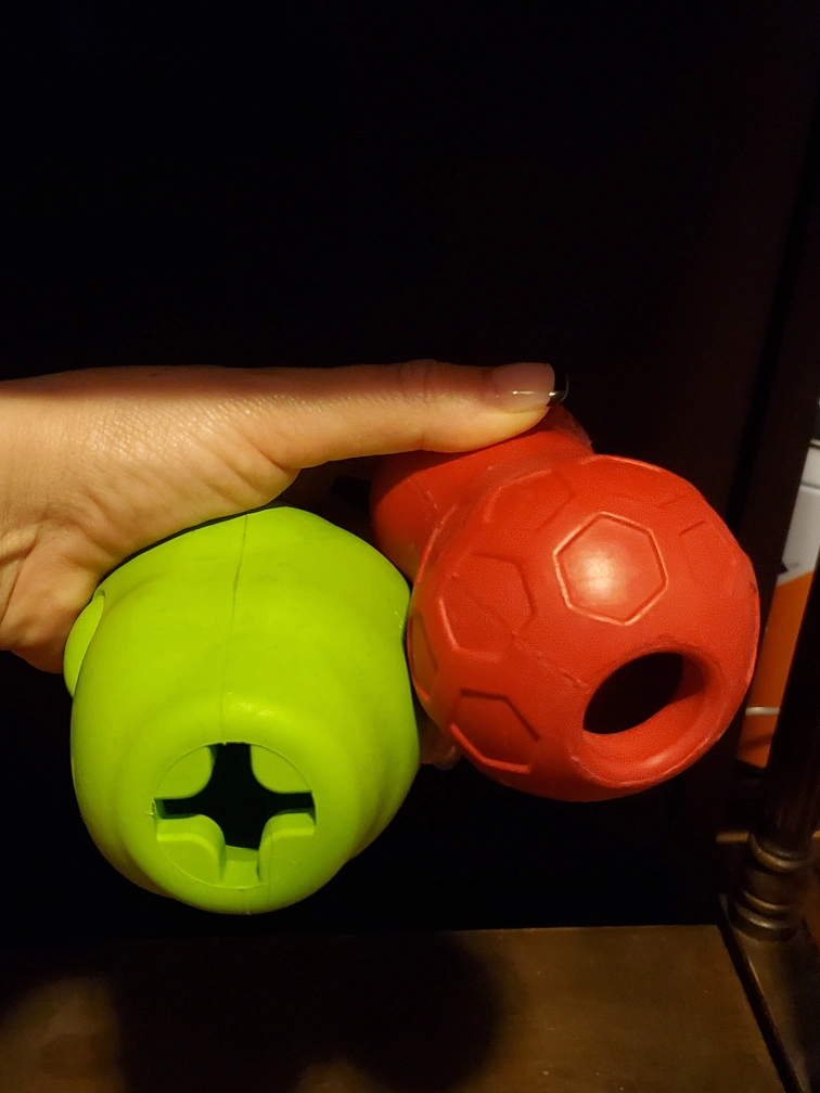 One green alien-shaped toy from Bullymake and one red honeycomb-shaped toy from JW Pet.