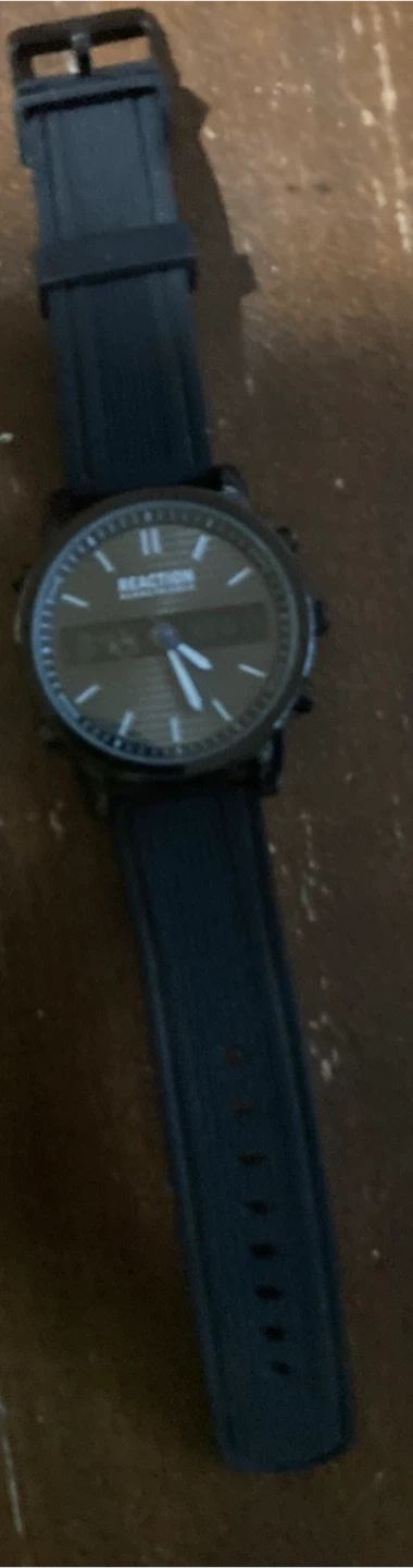This Reaction Kenneth Cole watch features a dark face with white markers. It has a black rubber strap with a buckle closure. An adjustable strap fits most wrists.