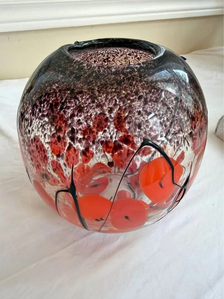 Beautiful vintage vase, likely Murano glass, featuring a "Souffle A La Bouche" technique with striking red poppies. The Art Deco style makes it a lovely decorative piece. Feel free to message if you have any questions!