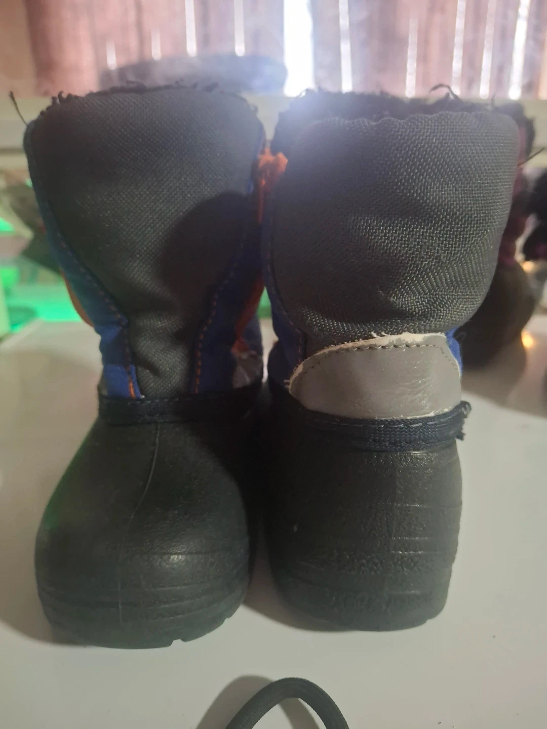 These are kids' winter boots with a black rubber sole and blue, orange, and grey fabric upper. The lining appears to be faux fur for added warmth. They're great for keeping little feet toasty in the cold weather!