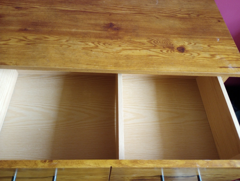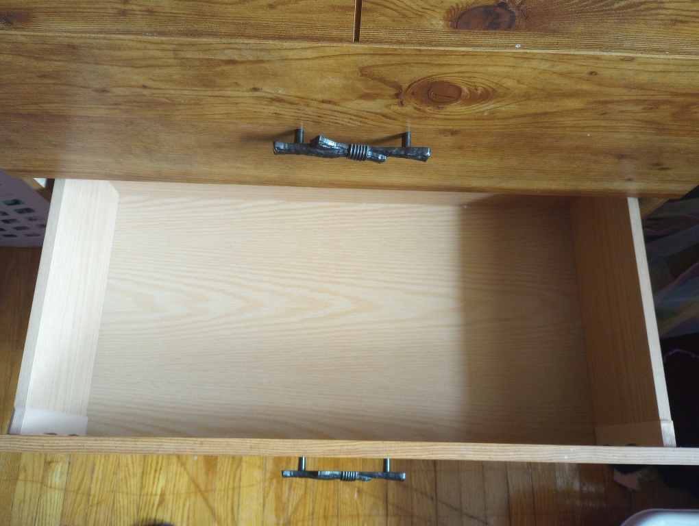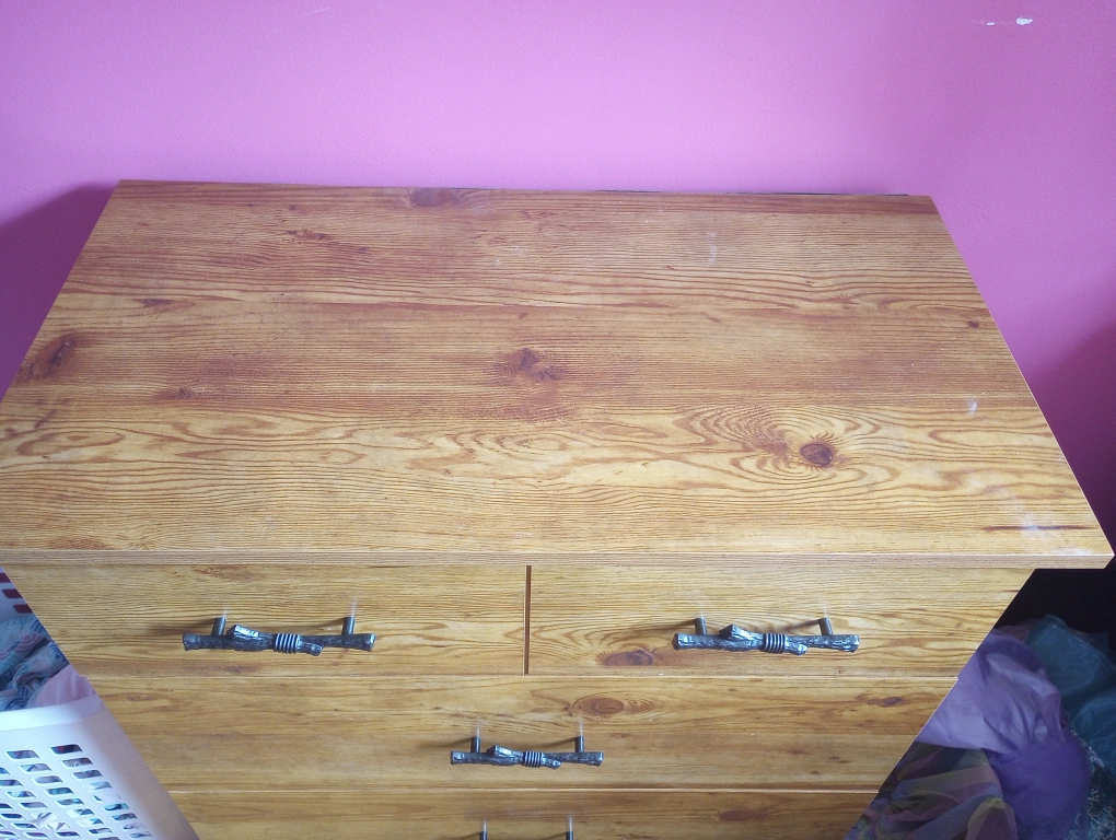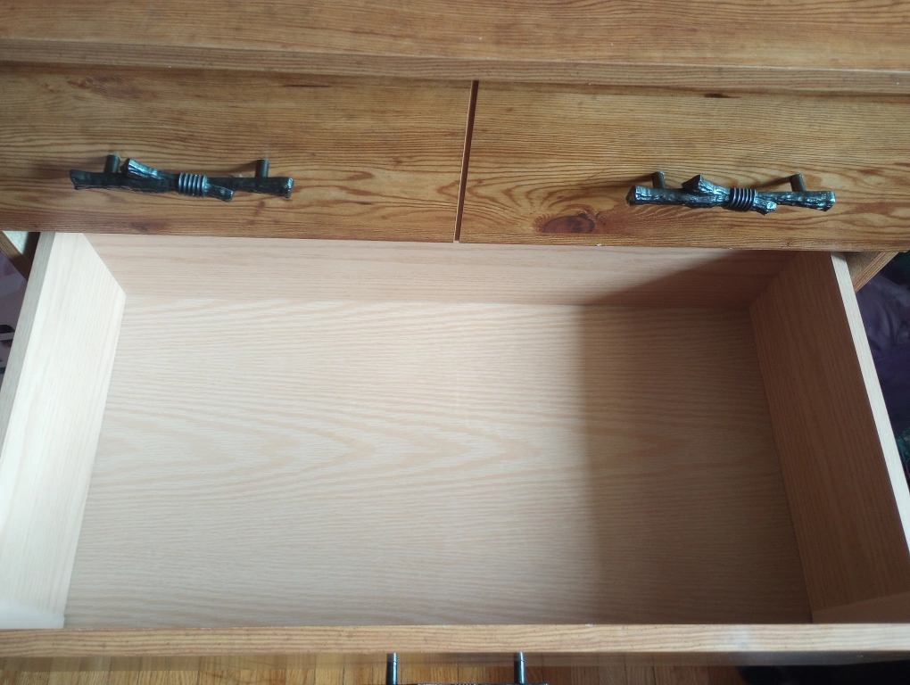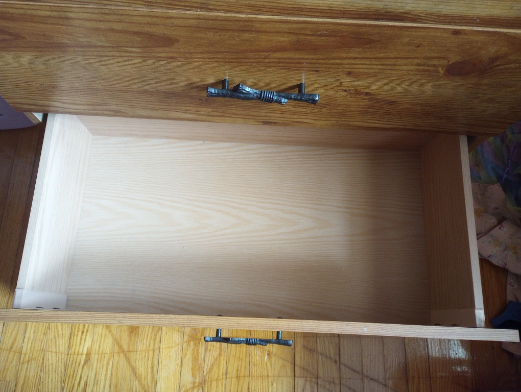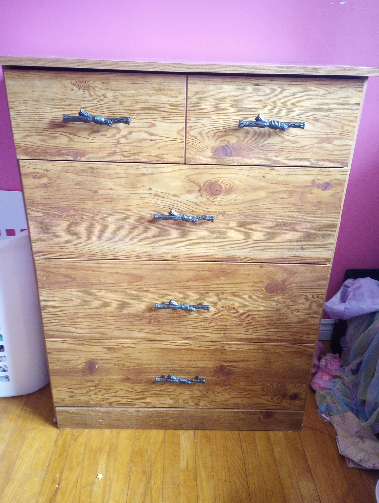 Four-drawer dresser in great condition. Light brown wood finish. Unique twig-style drawer pulls.