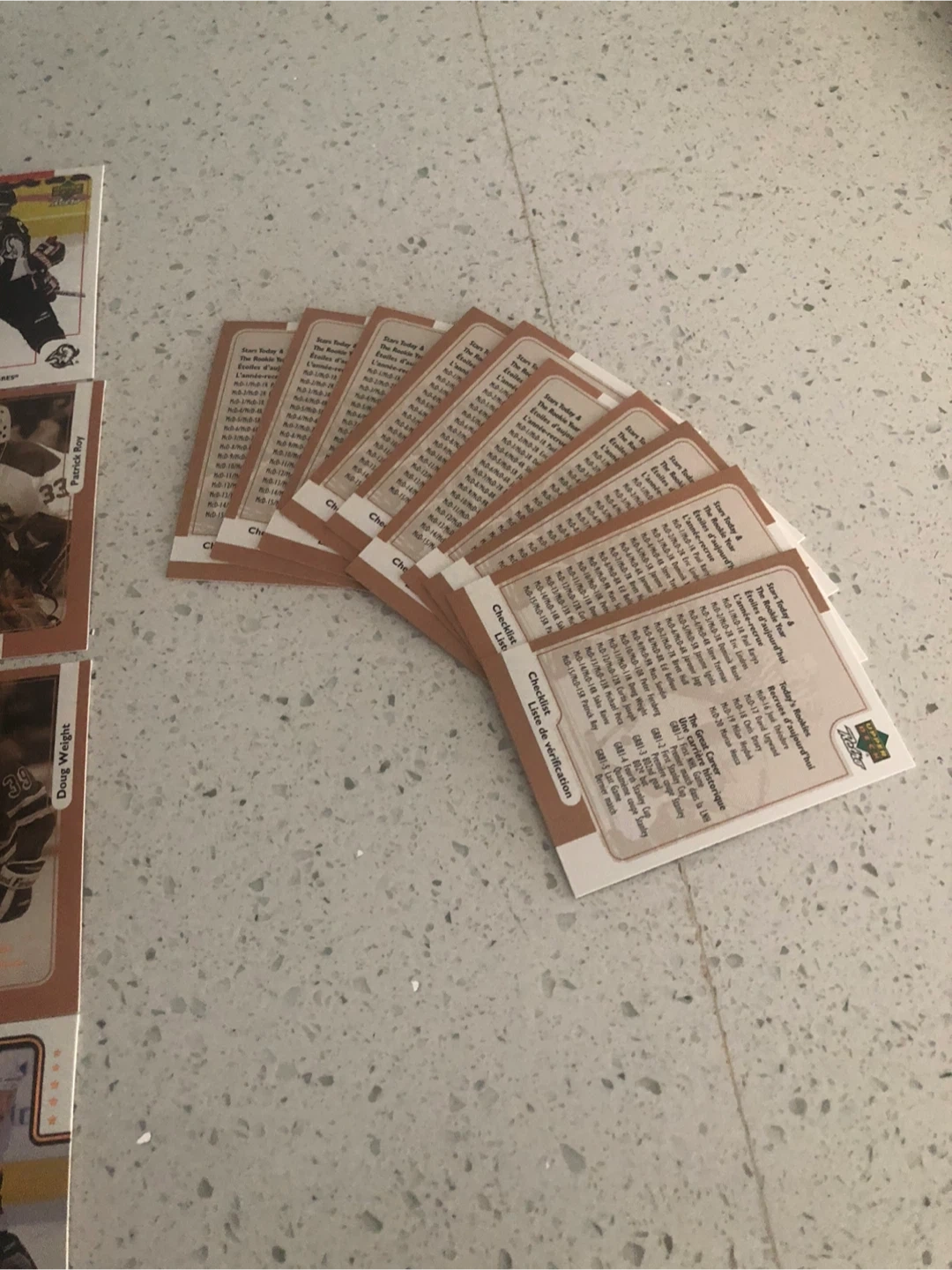A collection of various NHL hockey cards, featuring players from different teams. These are collectible sports cards, perfect for any hockey enthusiast. Many feature player stats on the back 28 cards 12 extra duplicates 12 check list cards Gretzky card $15 on its own