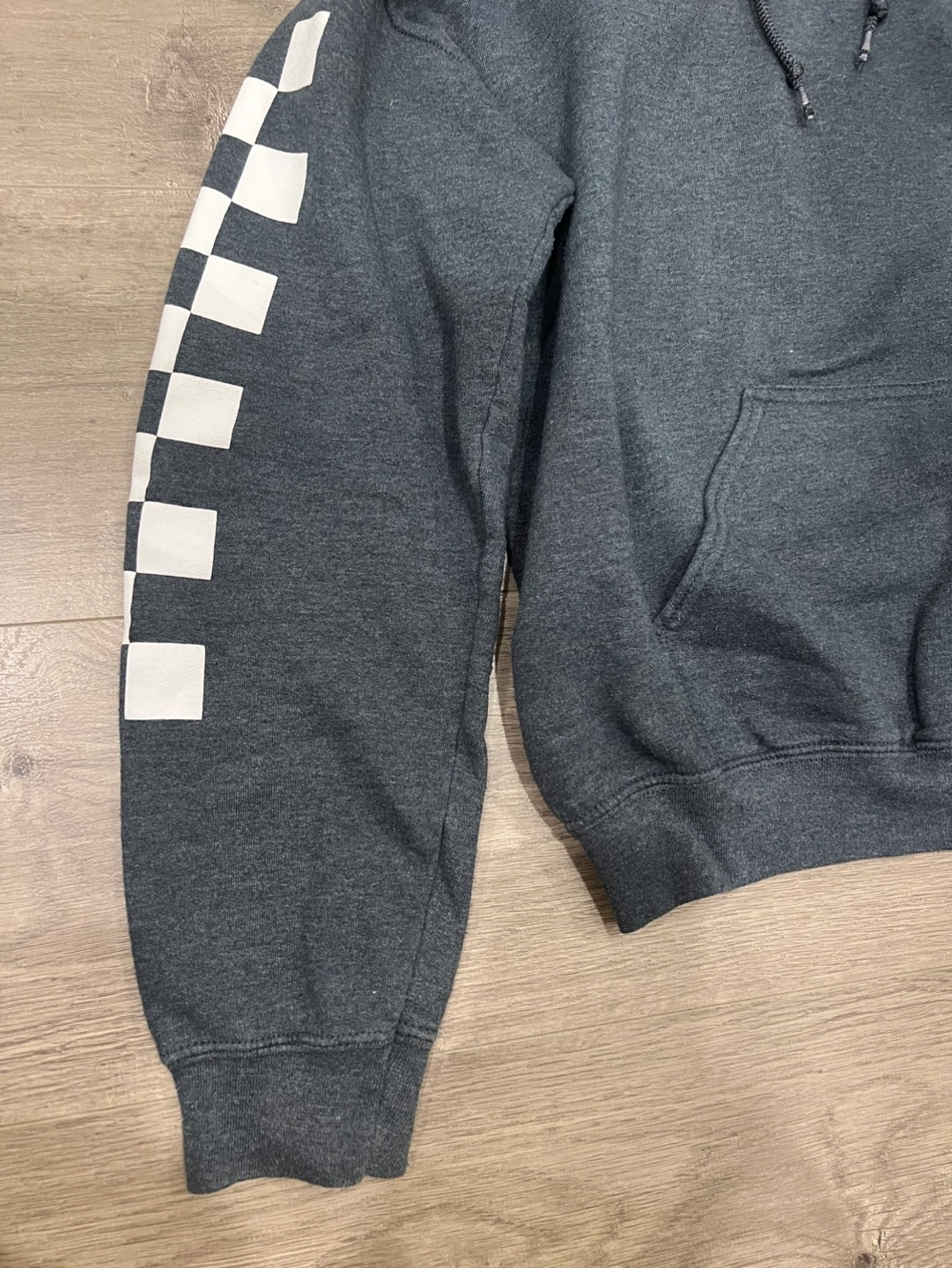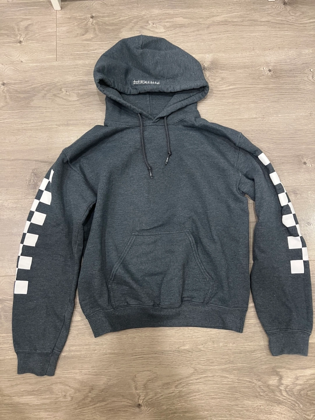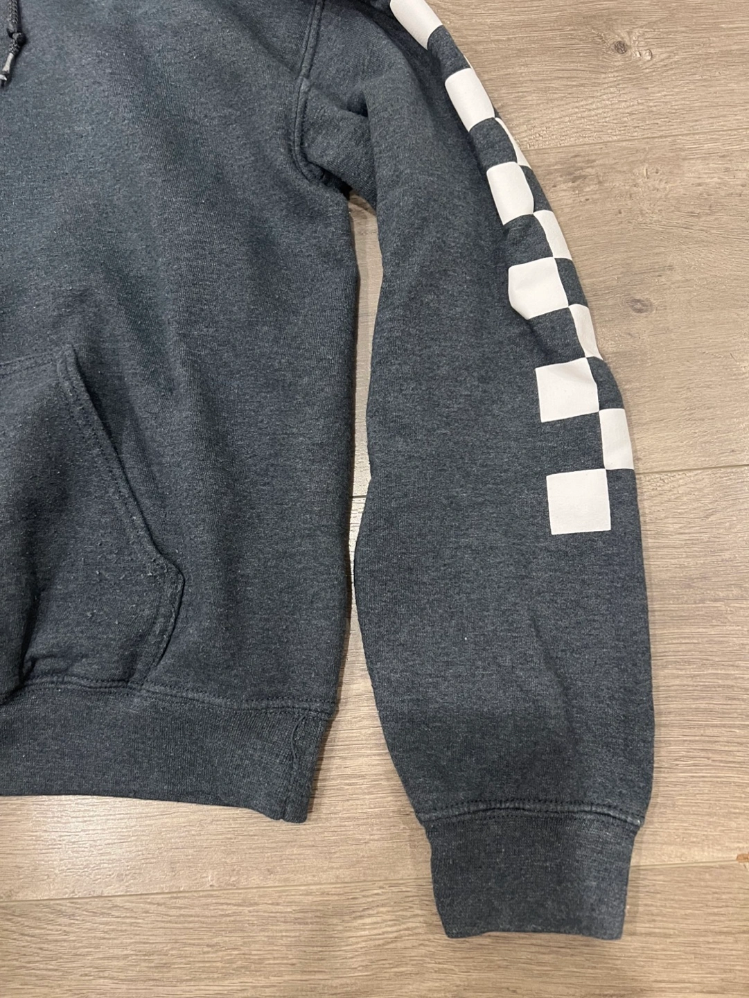 Dark grey pullover hoodie. Features a small Intercept logo on the hood and white checkered pattern on the sleeves. Size small.