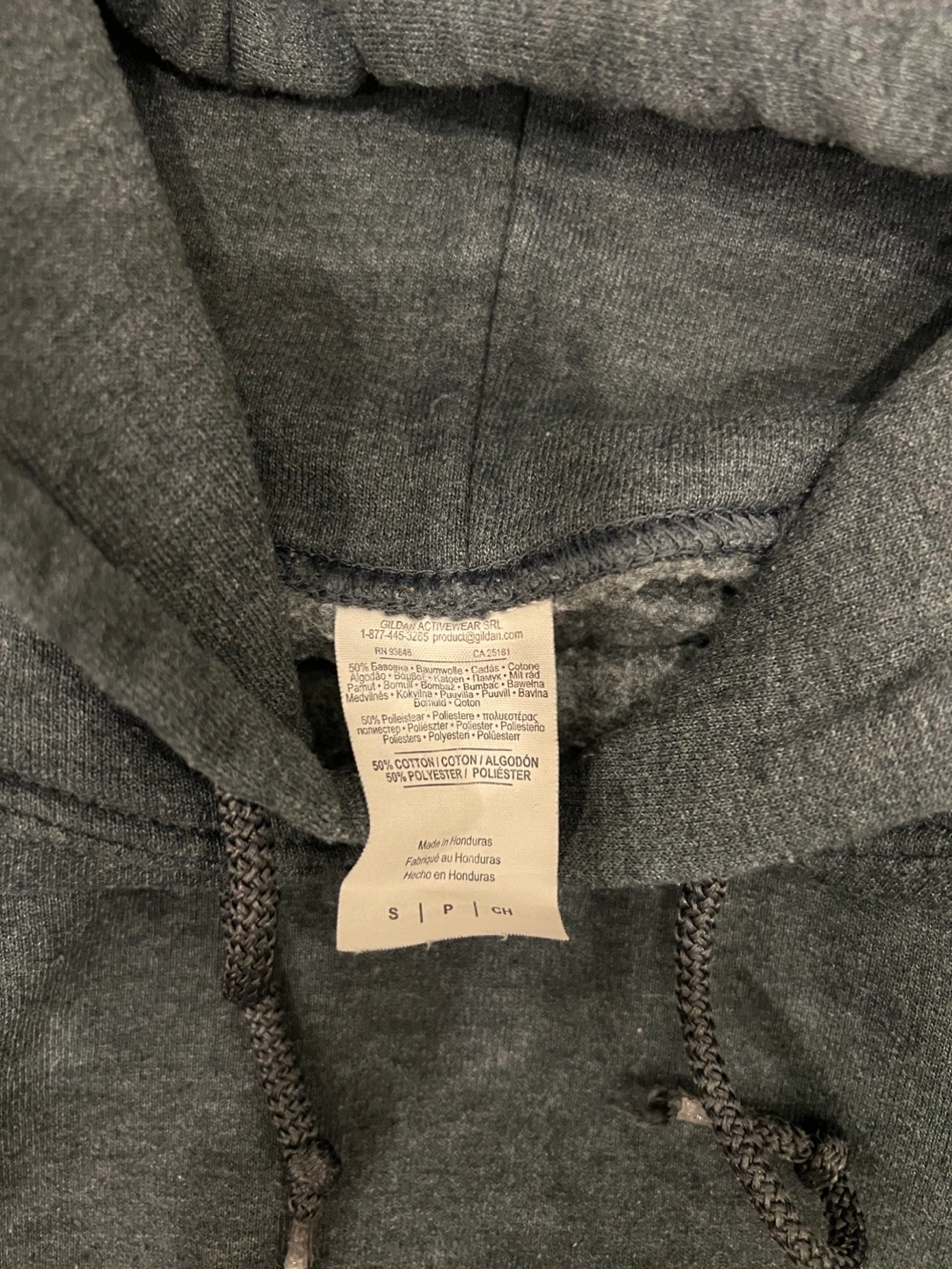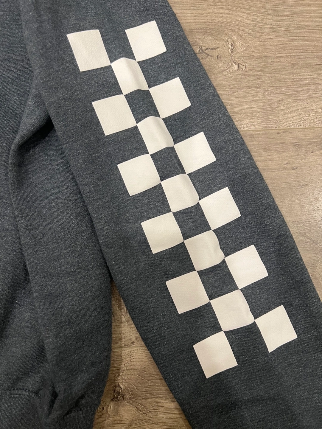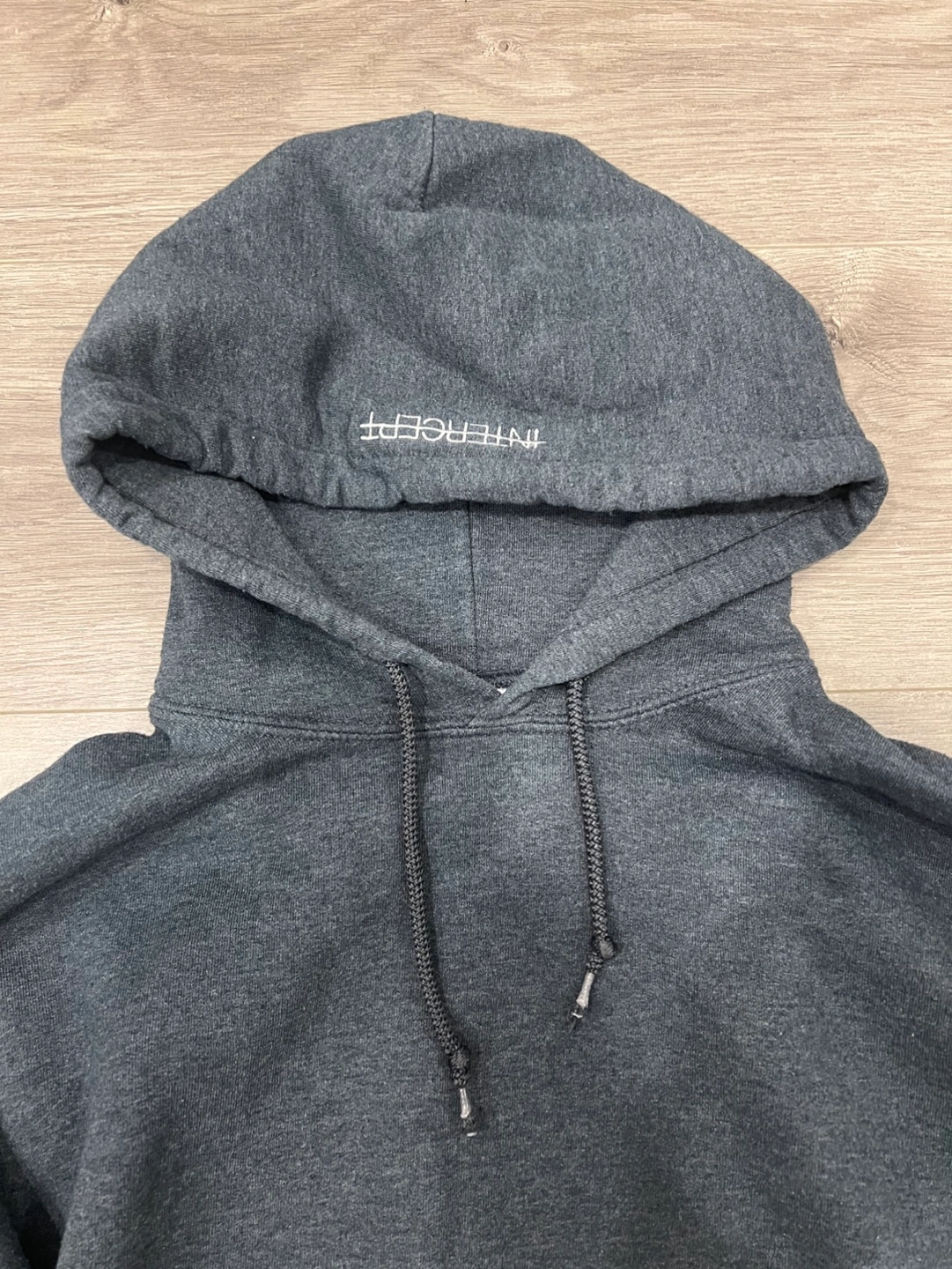 Dark grey pullover hoodie. Features a small Intercept logo on the hood and white checkered pattern on the sleeves. Size small.