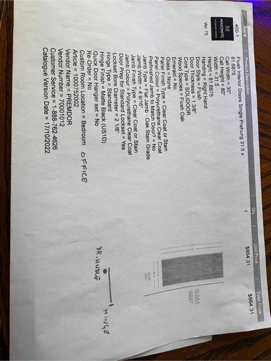 This is a new Masonite flush interior door with a clear coat finish and matte black hinges. It's a prehung door with a right-hand opening. The door is 1 3/8" thick and made with SOLIDOOR core.cash only