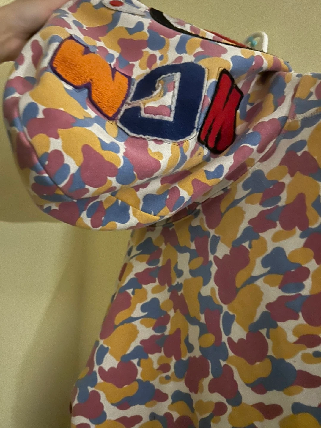 This BAPE hoodie features a colourful camo pattern. It has the signature BAPE shark graphic on the hood and a woven logo patch on the sleeve. Made from comfortable fabric.