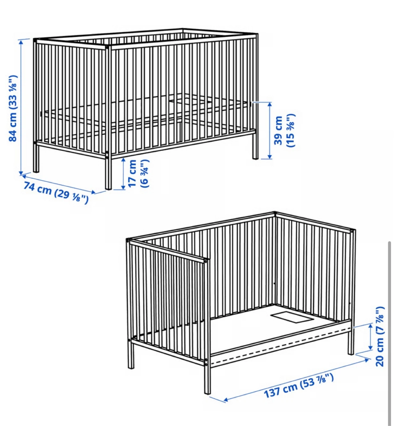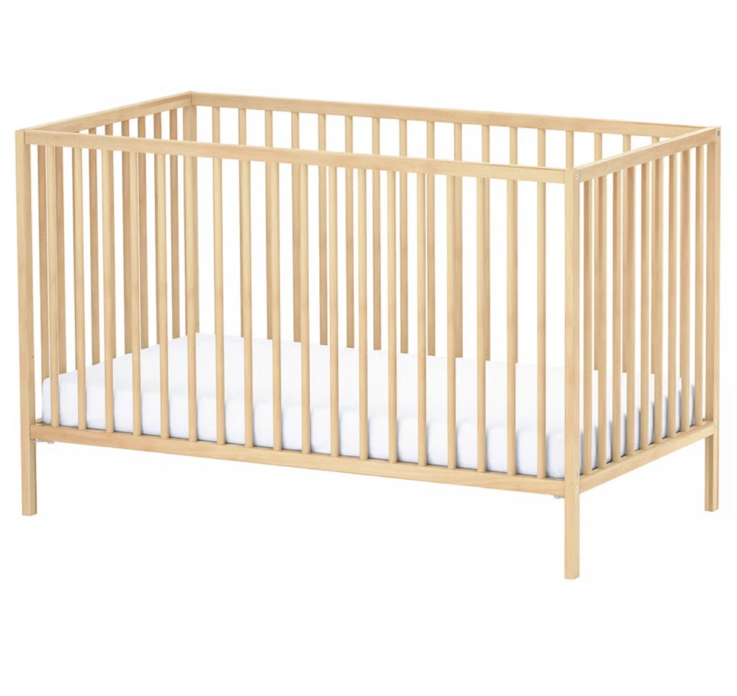 This is an IKEA baby crib. It's made of wood and includes a mattress. The crib measures 137 cm by 74 cm by 84 cm.