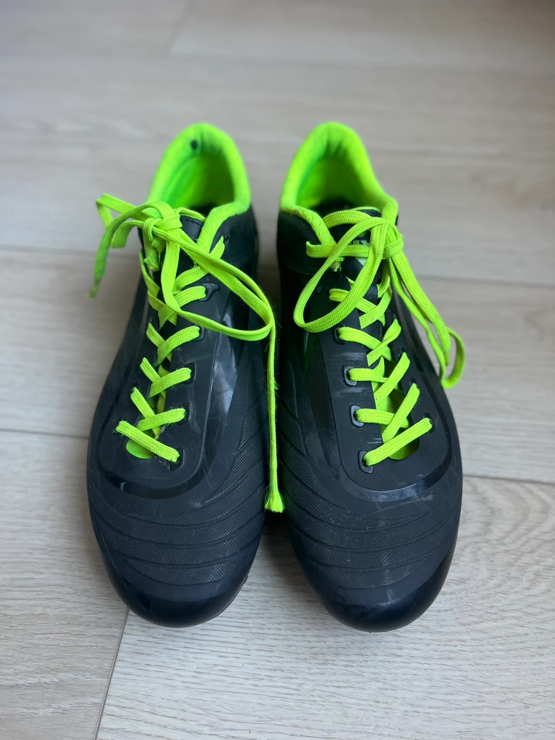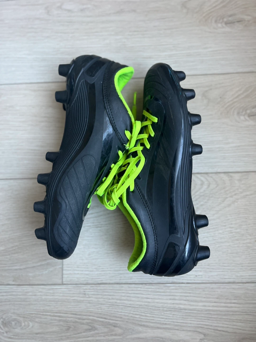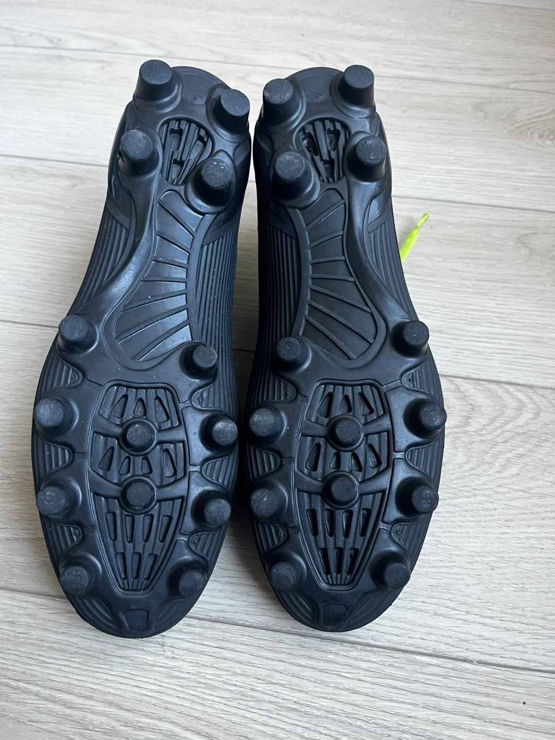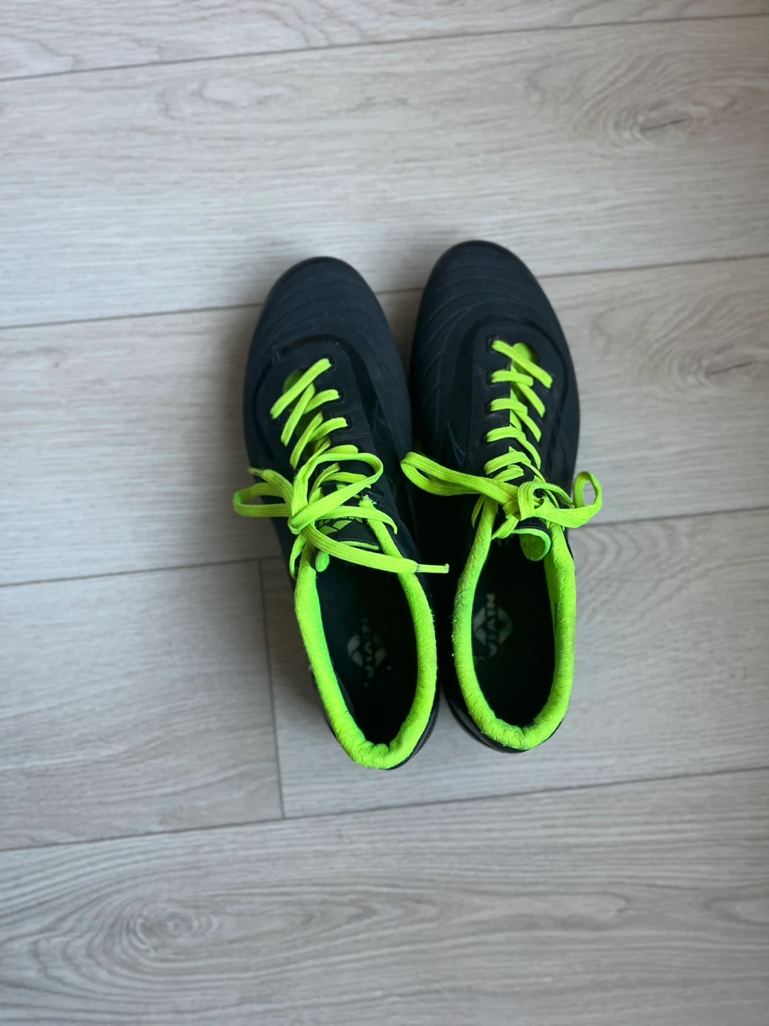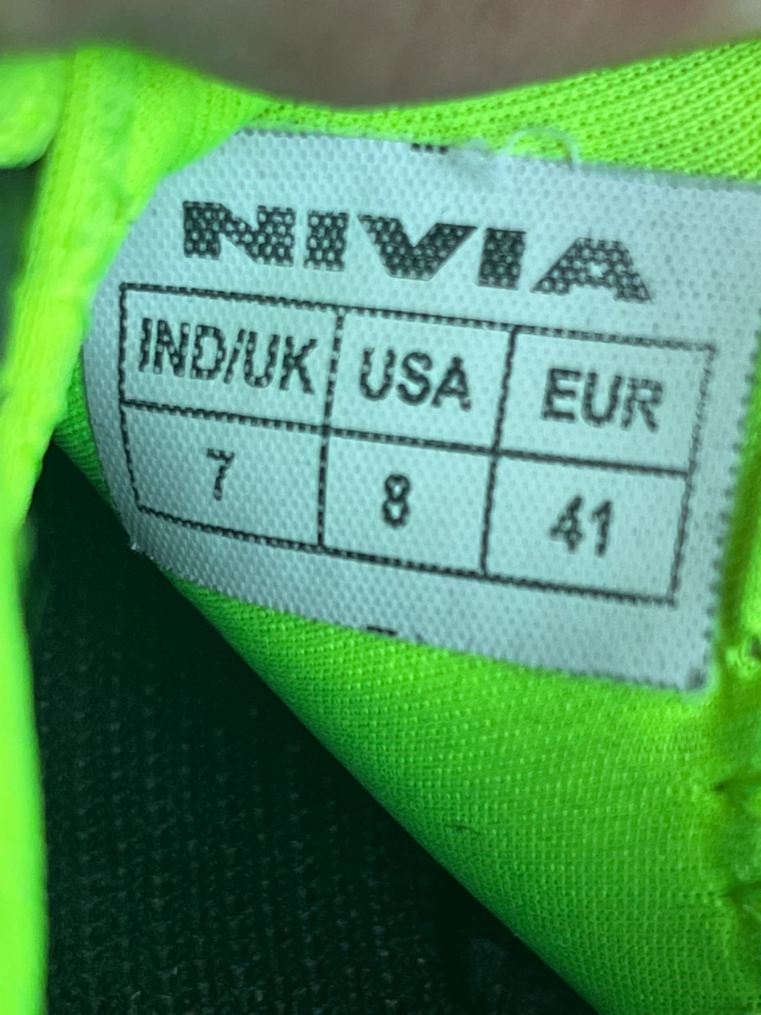 Black Nivia soccer cleats with neon green accents. Size EUR 41, USA 8, IND/UK 7. These cleats are ready for the pitch!
