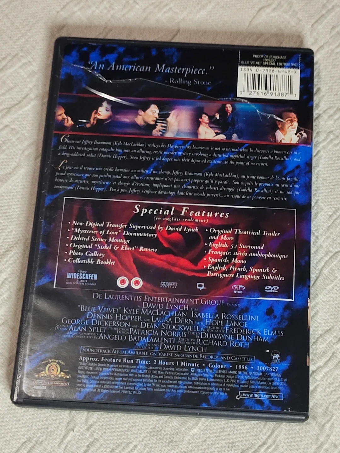 This is free items you pick up anytime ☺️ . Special Edition DVD of "Blue Velvet". It includes original theatrical trailer and photo gallery. This version comes with a French language track and Spanish subtitles.
