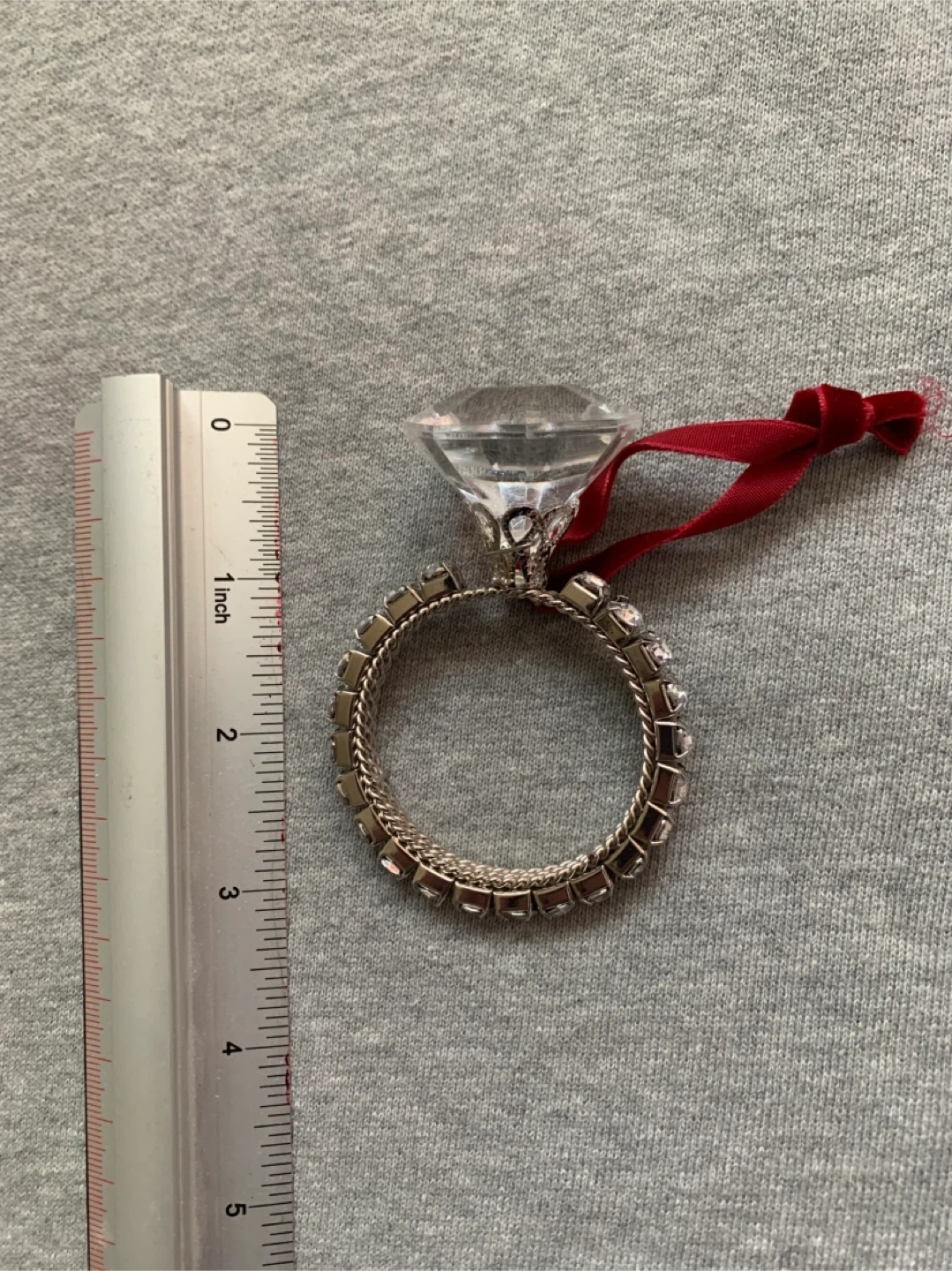 This festive ornament resembles a diamond ring. It features a clear faceted diamond top with a silver band adorned with small rhinestones. A red ribbon is attached for hanging.