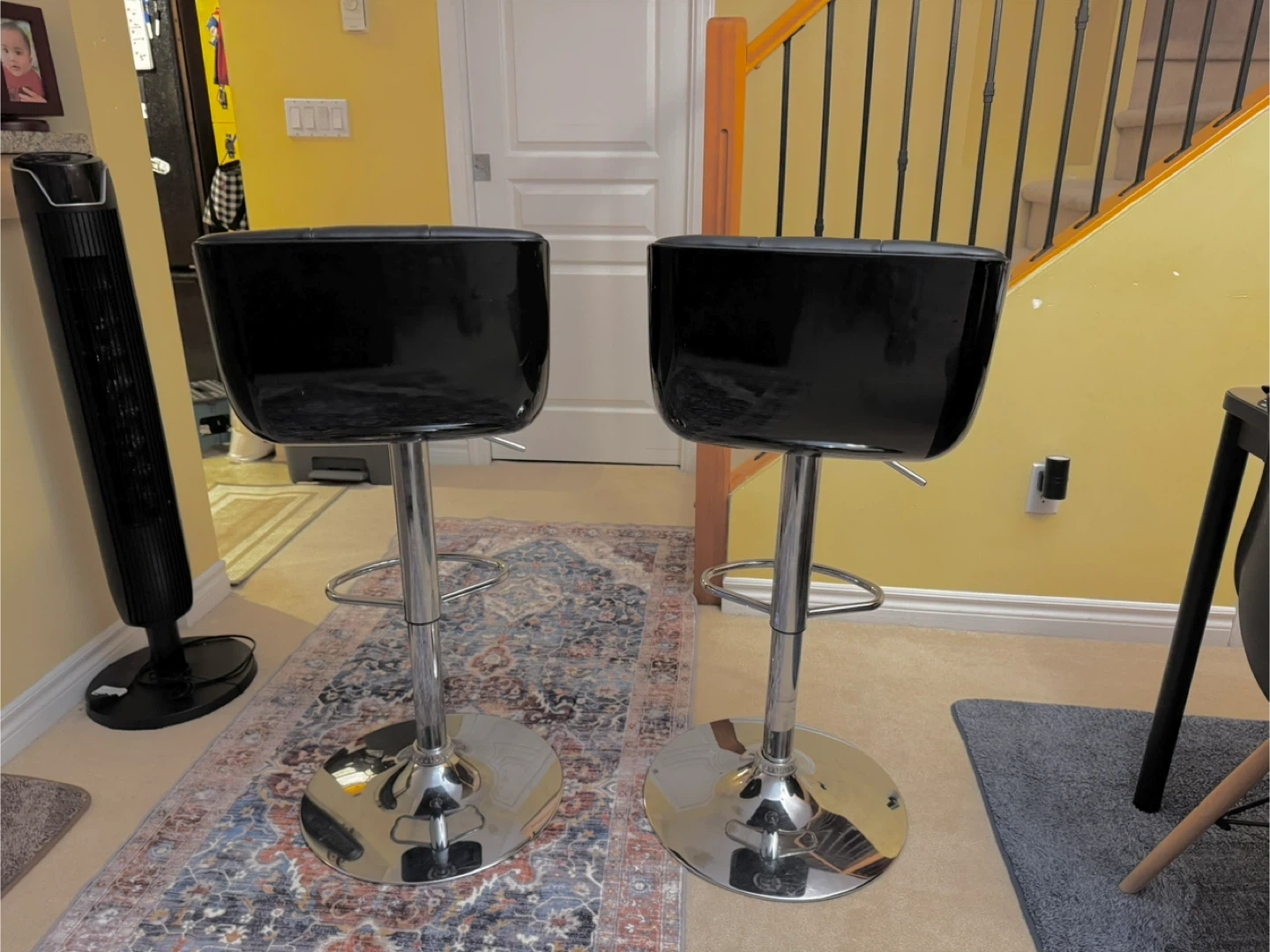 Two adjustable height bar stools with black faux leather seats and chrome bases. They've got a cushioned seat and back for comfort. These stools are great for a kitchen island or home bar.