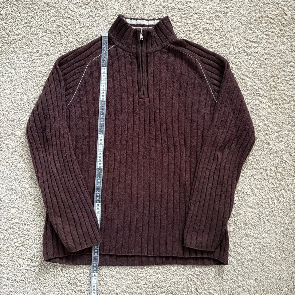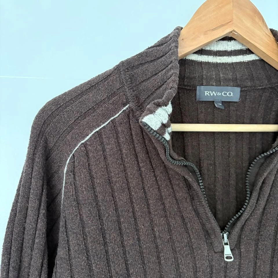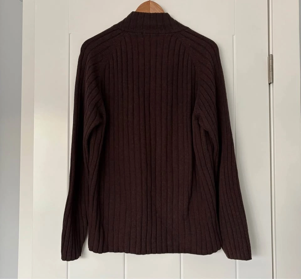 RW&Co. Neutral Chocolate Brown Ribbed Long Sleeve Sweater with Half Zip. Featuring a cozy and soft, stretchy fabric with a ribbed knit texture for added warmth and style. Good condition with general wear, particularly back of sleeves and some piling as shown. Men's Size Medium. 60% Cotton, 20% Lambswool, 20% Nylon. Measurements are approx.: Length 68cm, Pit to pit 54cm. Porch pick up west Maple Ridge.