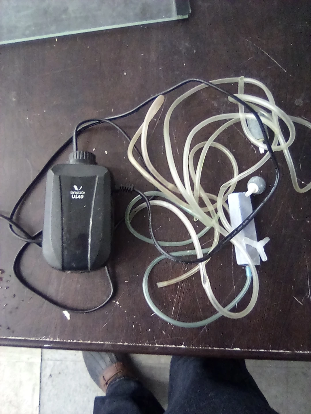 This is a Uniclife UL40 aquarium air pump. It comes with air tubing and an air stone. It's a black plastic pump designed for aquariums.
