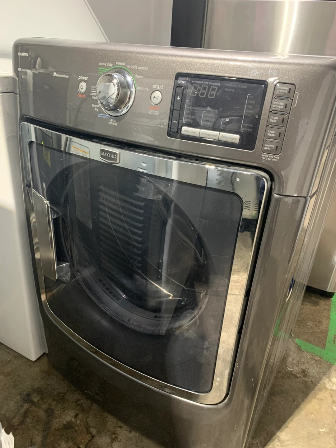 Maytag Maxima front load dryer. It's a grey gas dryer with various cycles like heavy duty, normal, wrinkle control, and delicate. It has steam and moisture sensing capabilities. Perfect for drying all your laundry needs!