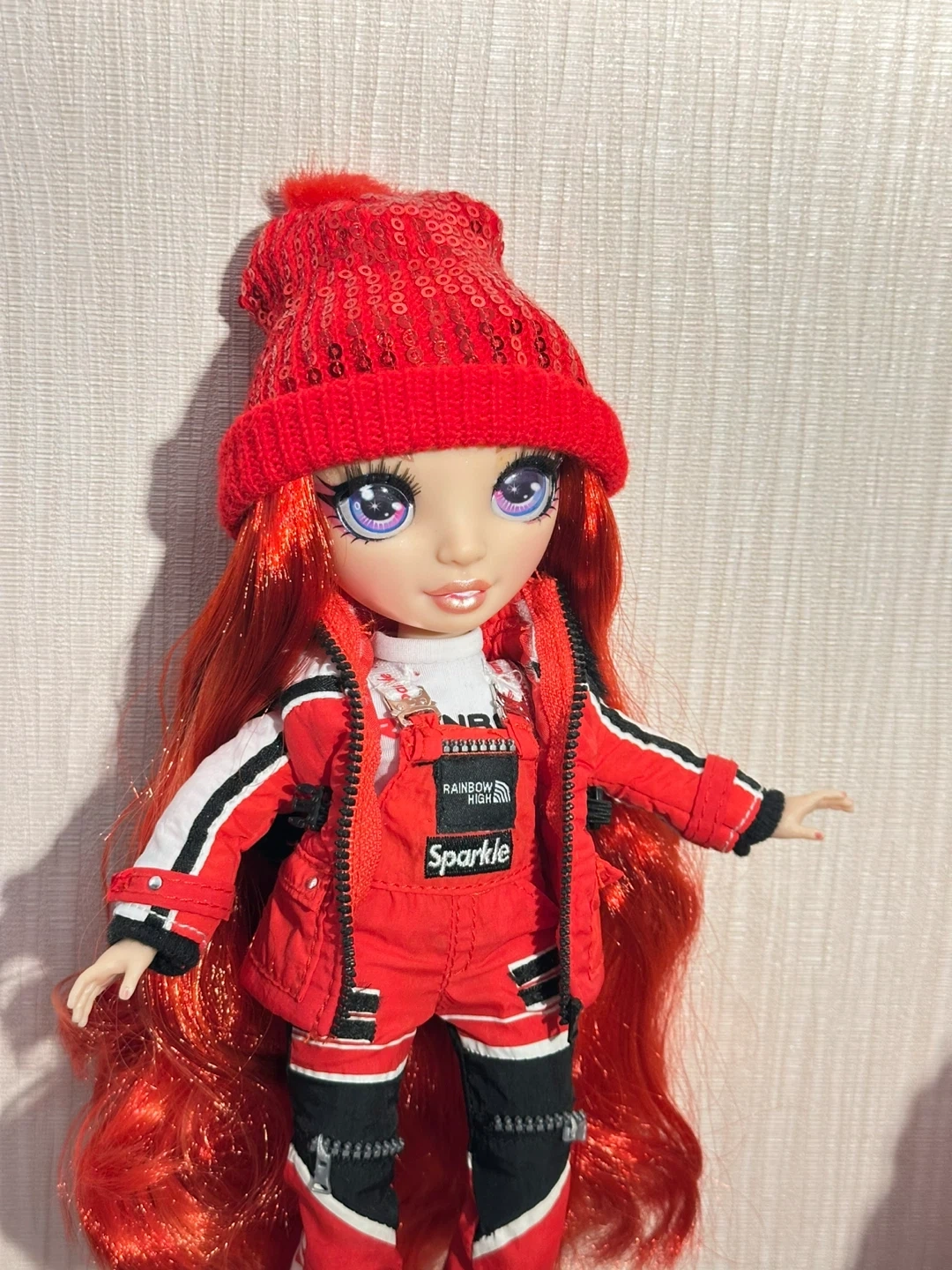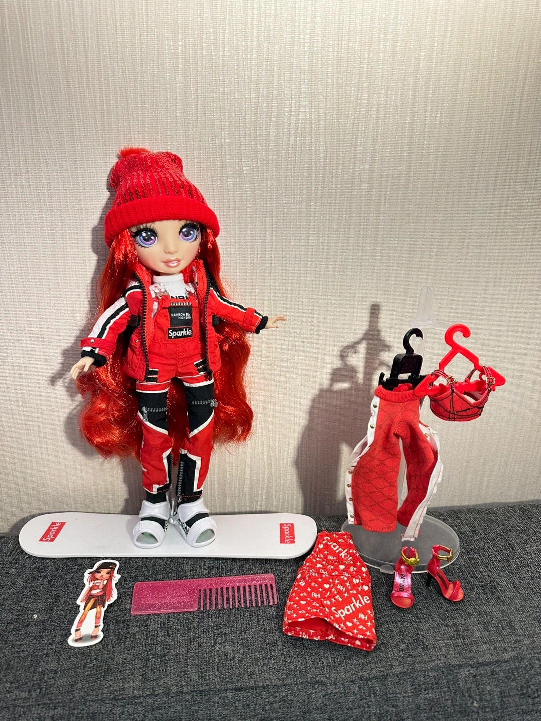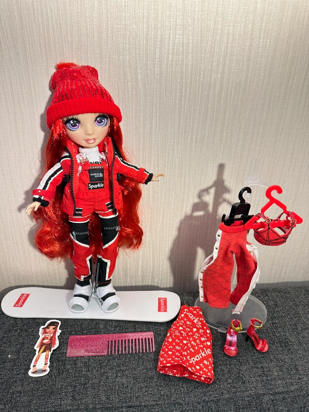 This is the Ruby Anderson doll from Rainbow High's Winter Break collection. It comes with a red snowboard and multiple red and black ski-themed outfits.