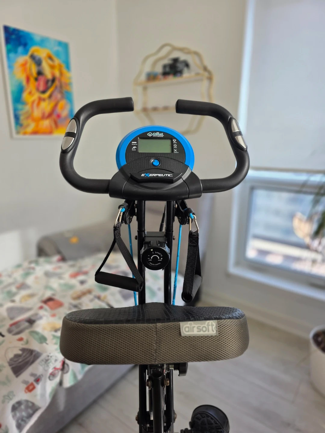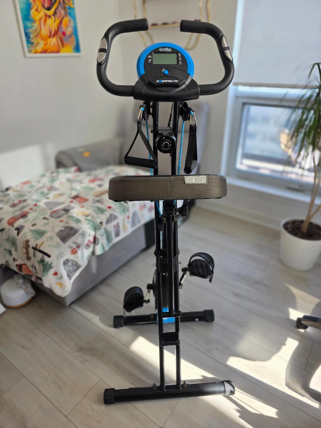 This EXERPEUTIC upright bike offers Bluetooth connectivity and built-in resistance bands for a full-body workout. It's designed to be foldable for easy storage. The bike has adjustable resistance to suit your fitness level.