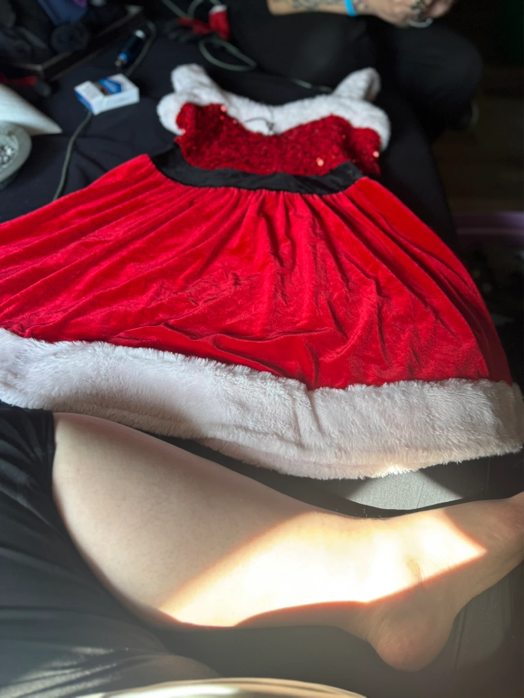 This festive red dress features a sequined bodice and white faux fur trim along the neckline and hem. It's perfect for holiday events and parties. The skirt is made of soft velvet material.