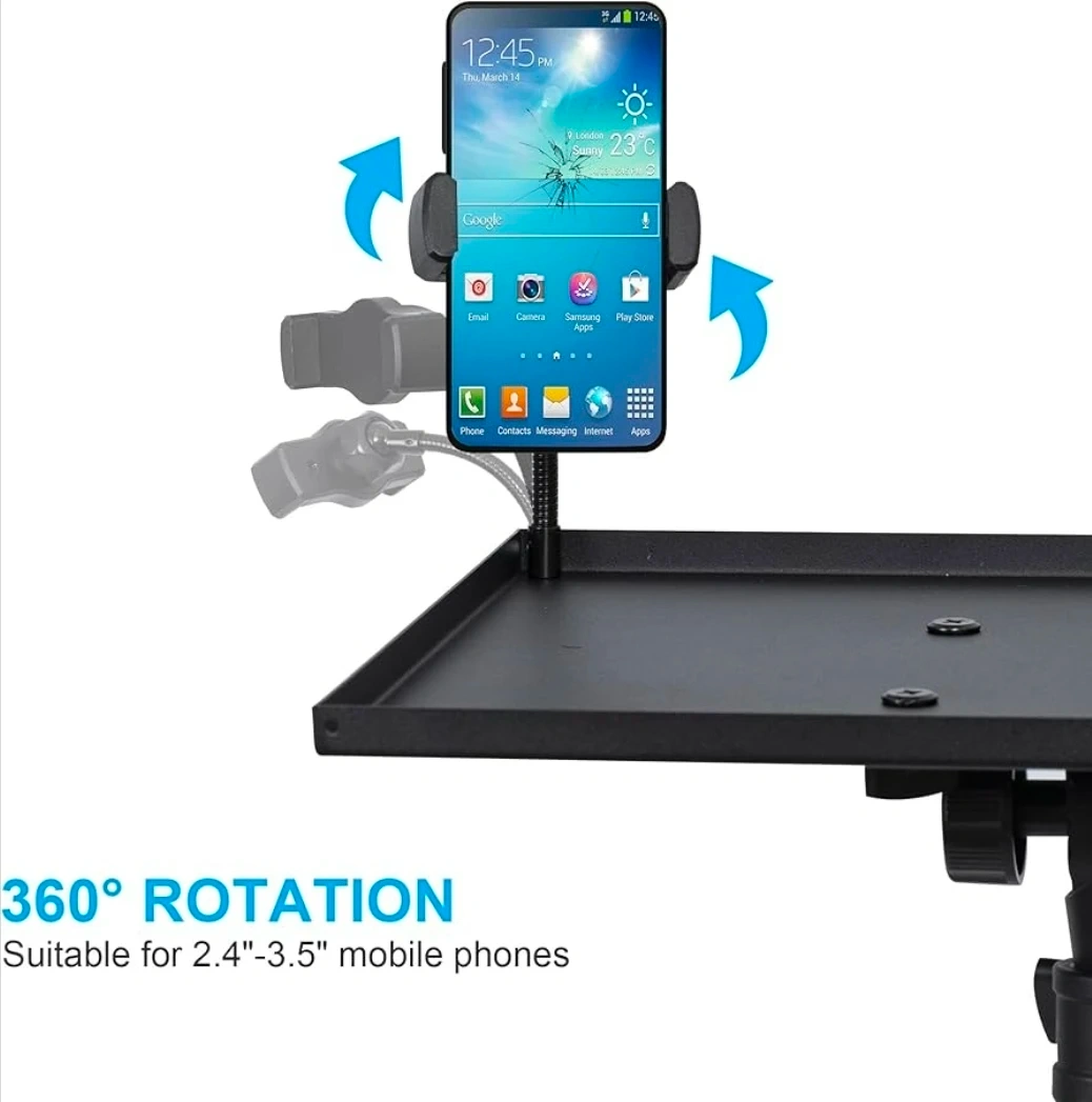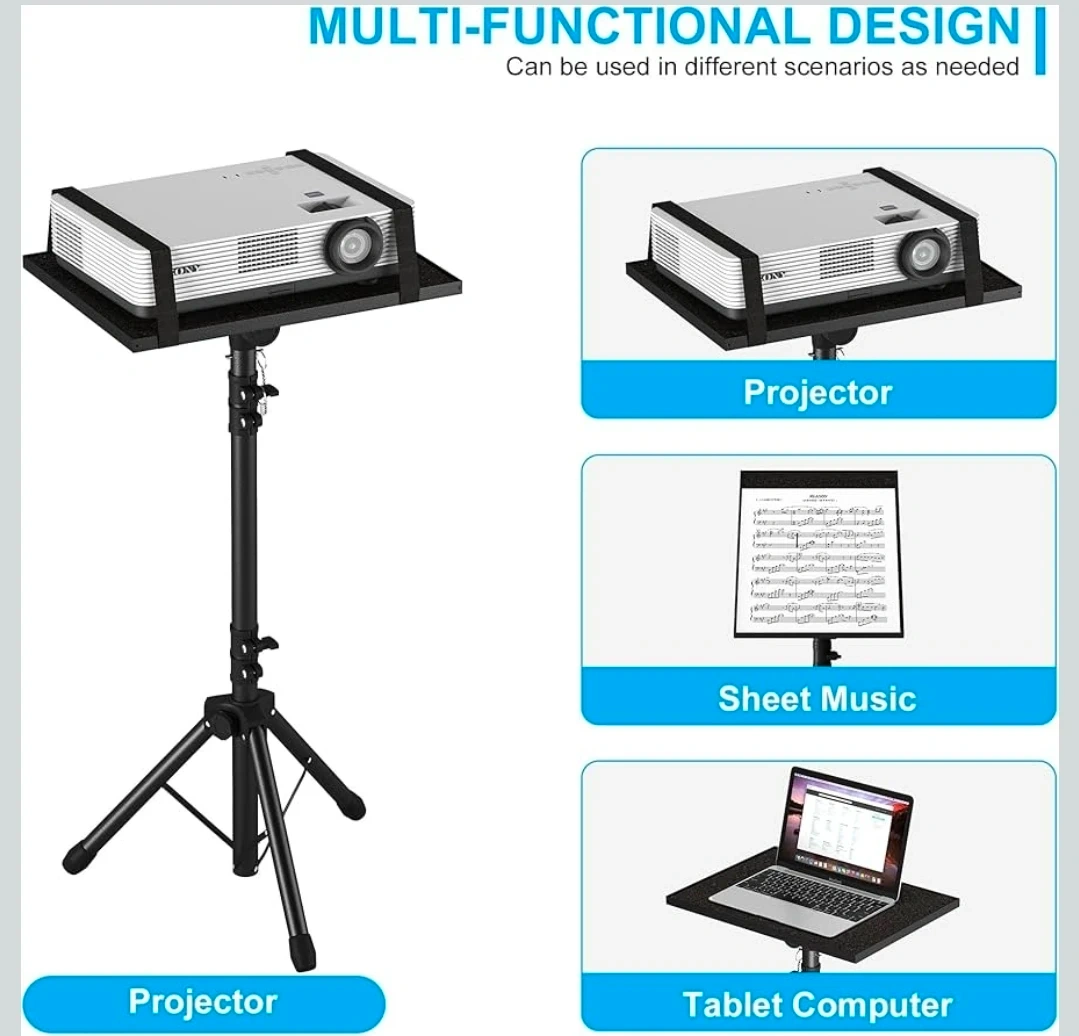 This DECOSIS stand is height adjustable from 23.5 to 46.5 inches. It includes a goose-neck phone holder and a thickened anti-skid pad for stability. It's suitable for projectors, laptops, or sheet music.