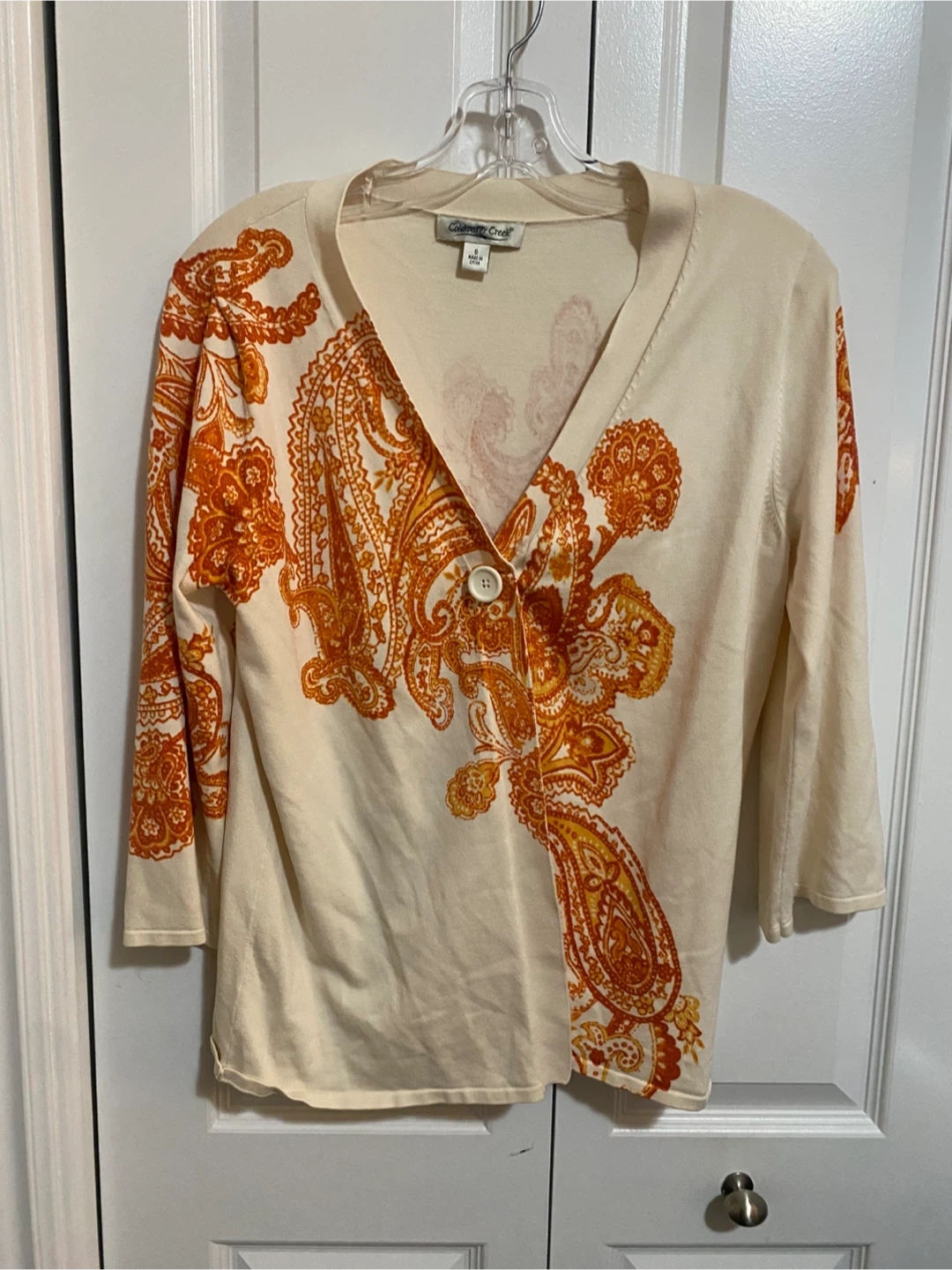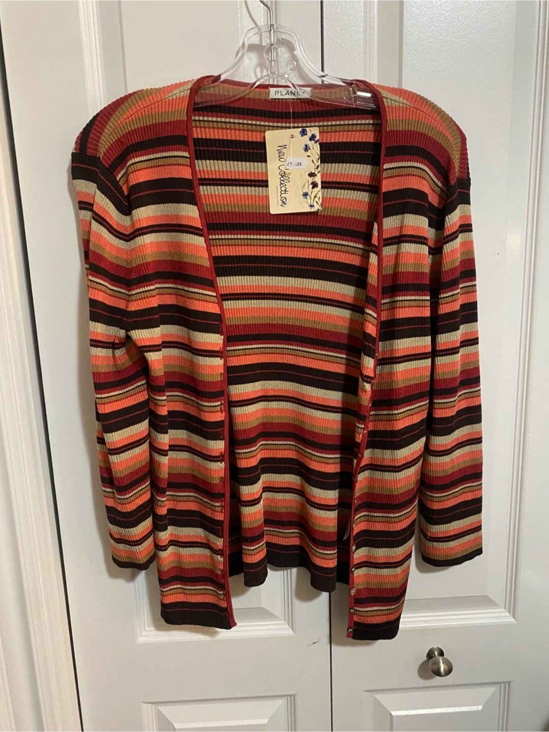 - Orange and beige cardigan, size L, $10