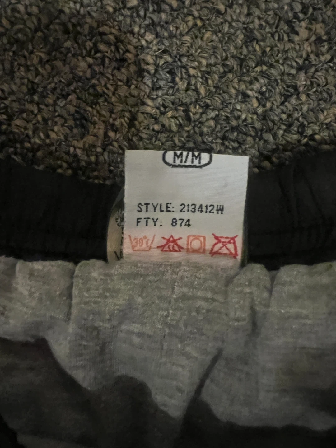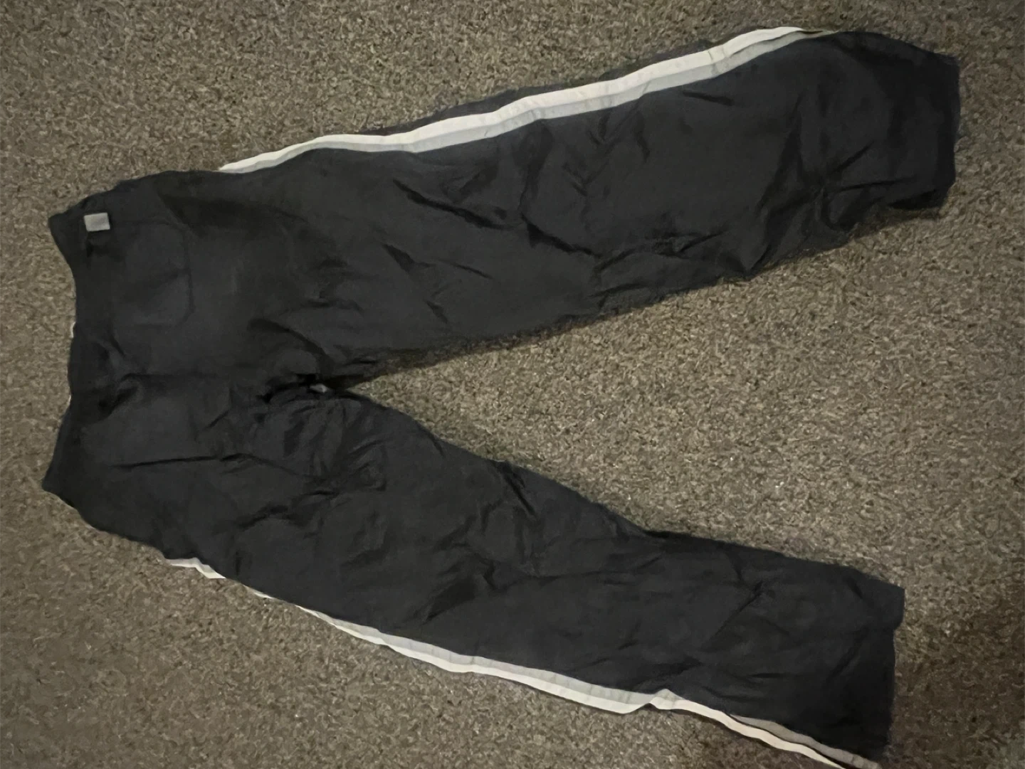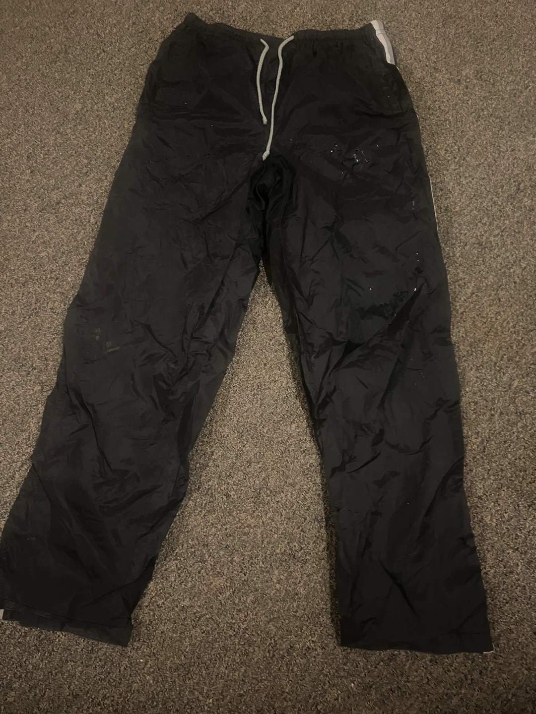 WindRiver black track pants with grey and white side stripes. Features a drawstring waist. Size is medium. Waterproof