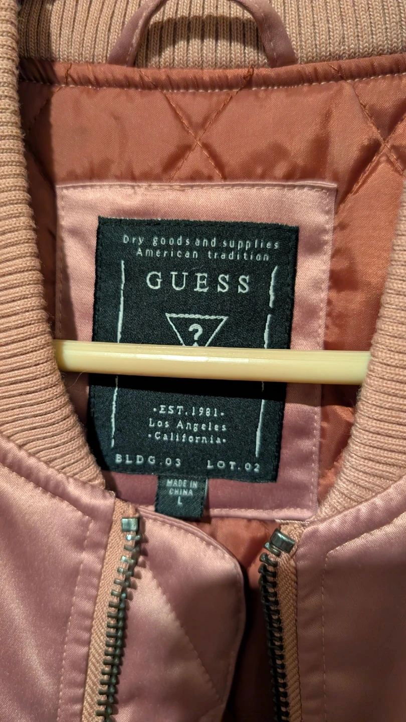Selling a Guess bomber jacket in a lovely pink colour! It's a size L and made of a smooth, silky material. Perfect for adding a pop of colour to your wardrobe and staying cozy on cooler days