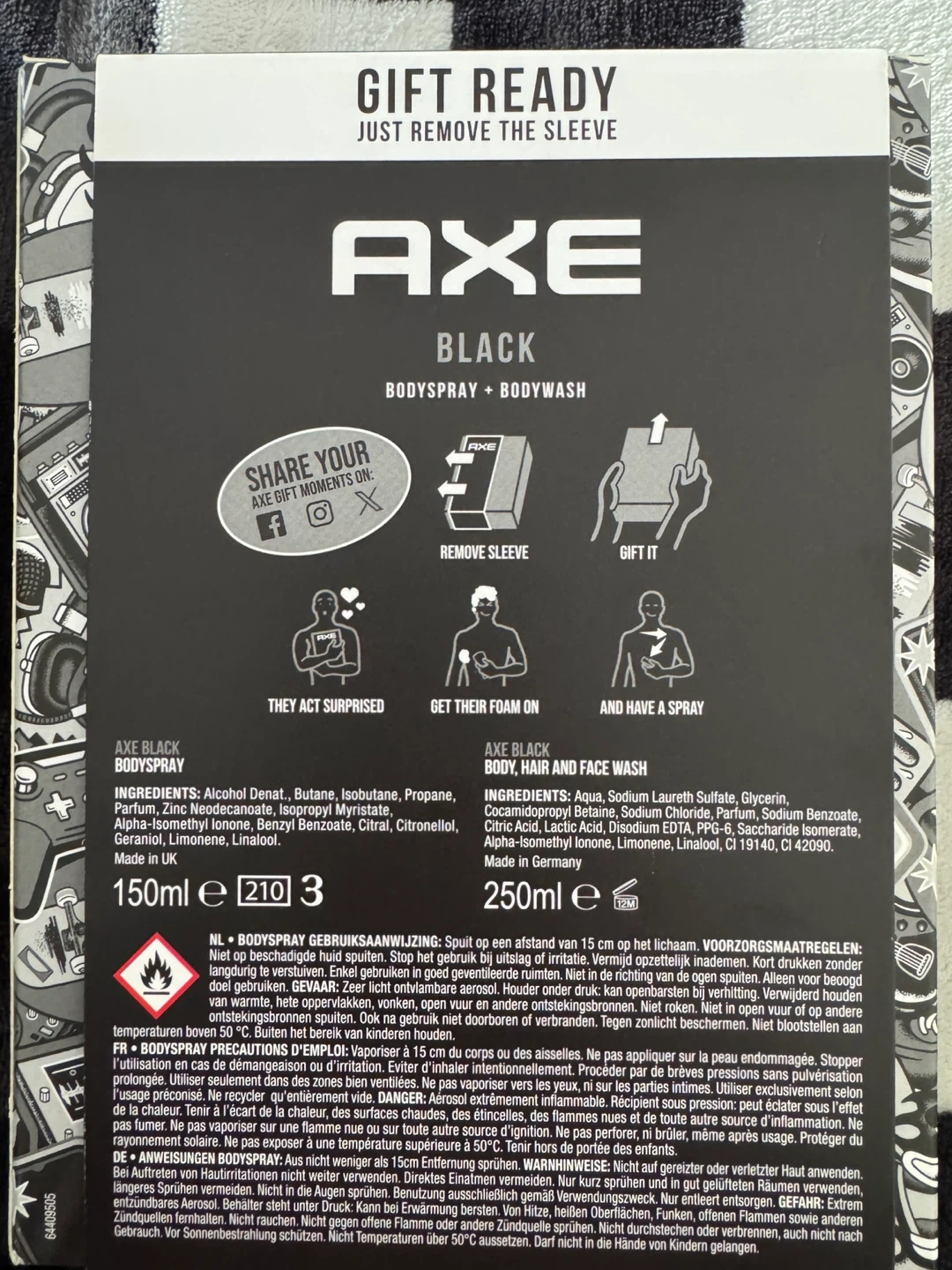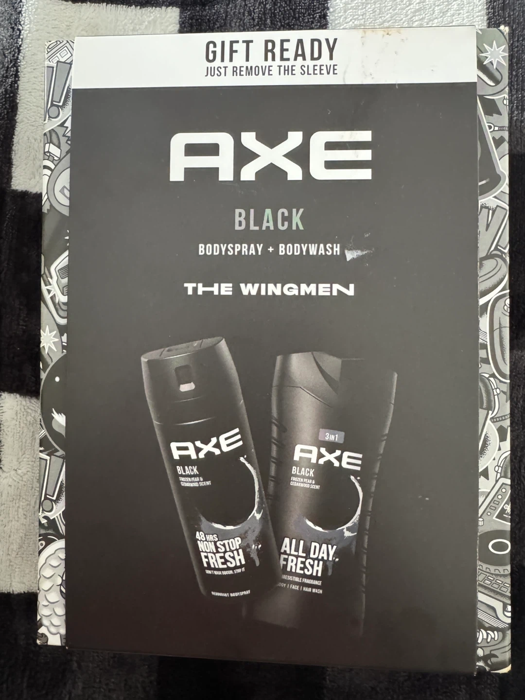 This AXE Black gift set includes a Deodorant Bodyspray and a 3-in-1 All Day Fresh Bodywash. Both have a Frozen Pear & Cedarwood scent. The bodyspray offers 48 hrs non-stop fresh, and the bodywash is for body, face, and hair.