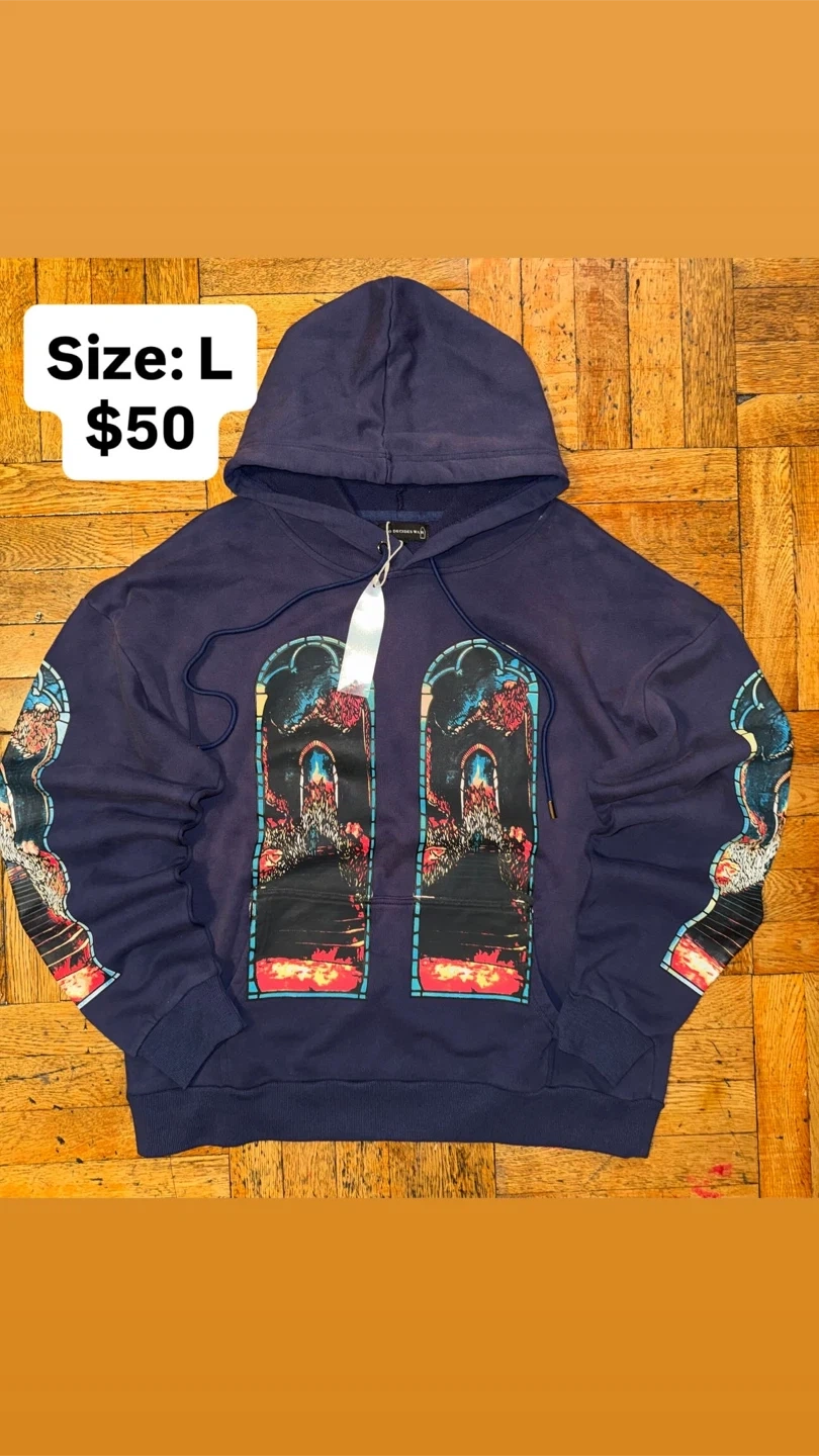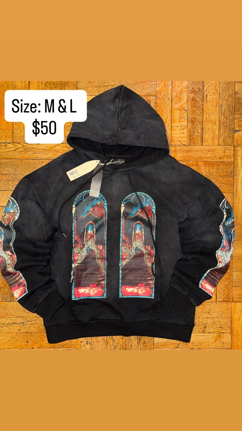 Selling a Midnight Studios hoodie in size L! It has a unique design and is in good condition. Perfect for adding a statement piece to your wardrobe