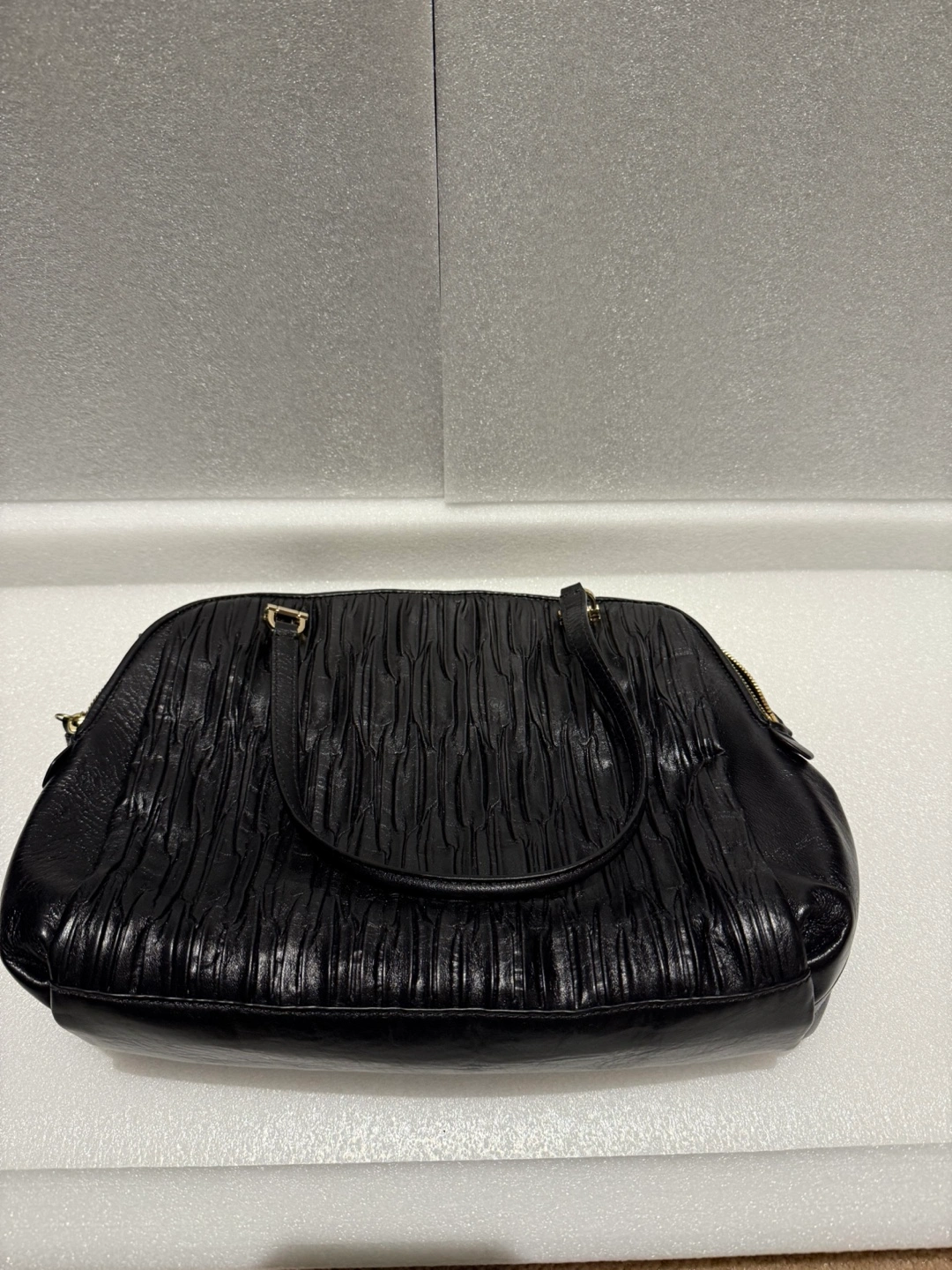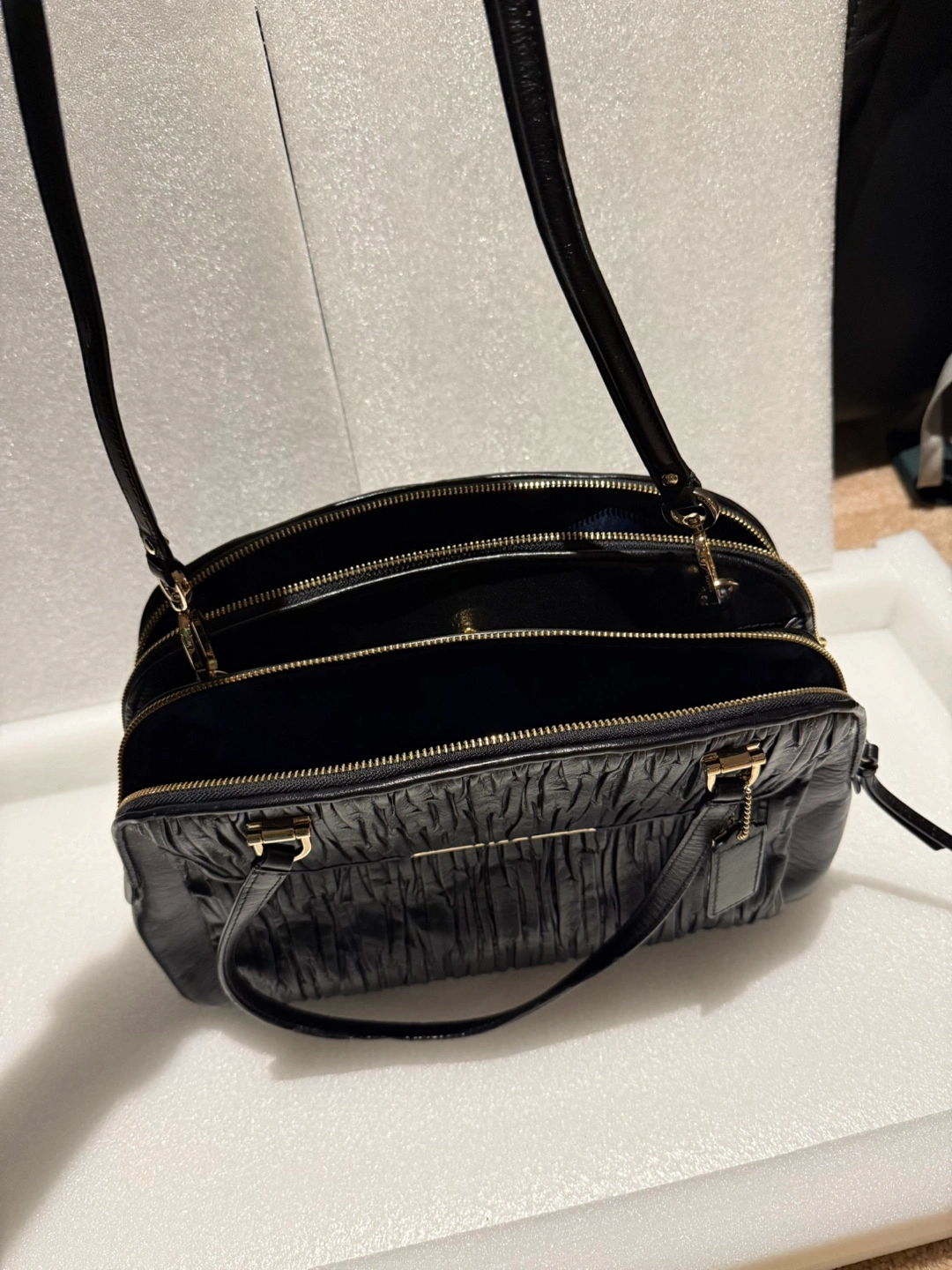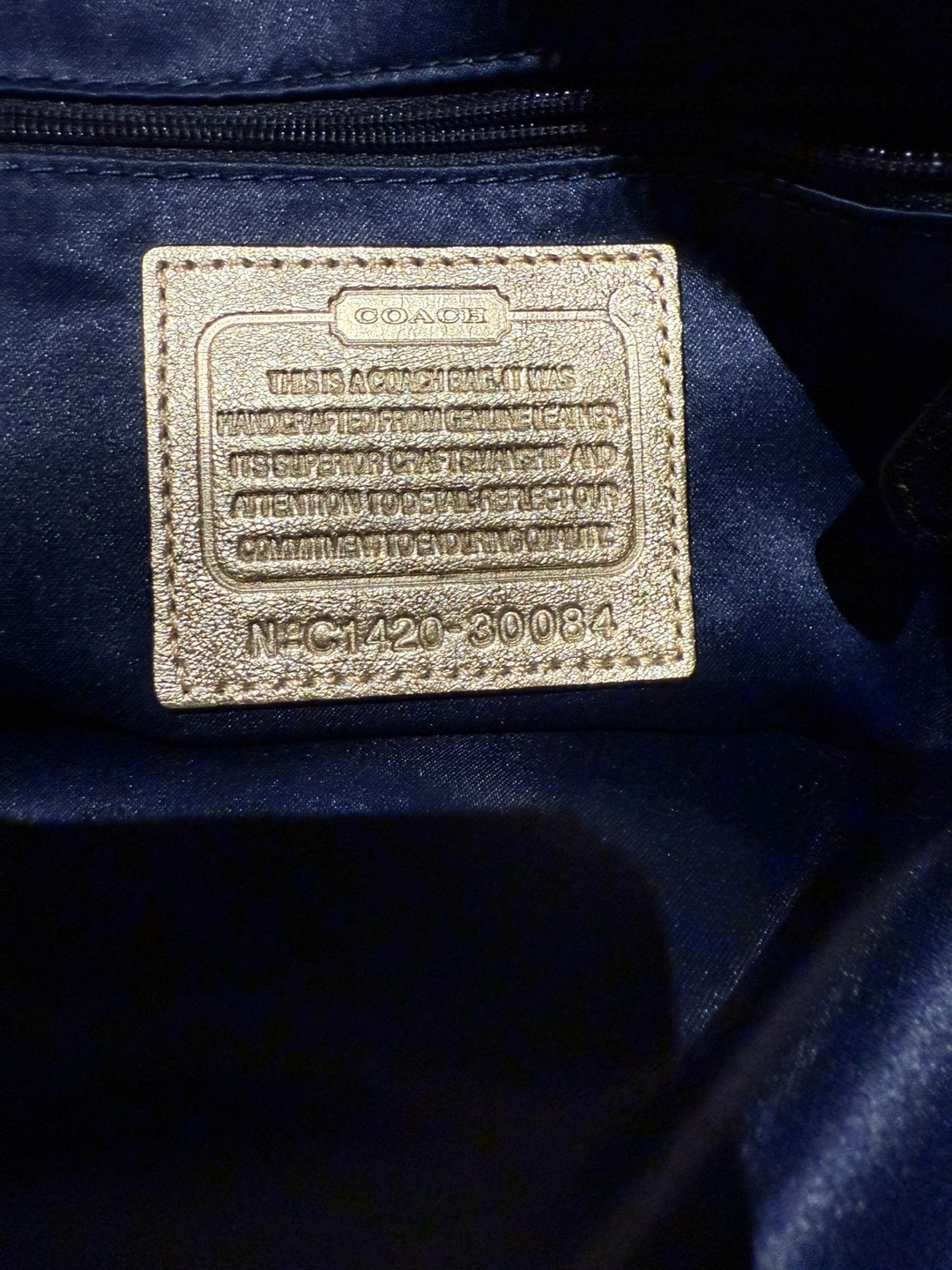 Black leather handbag. Double zippers. Two top handles and a shoulder strap. Interior has multiple compartments. Plated hardware. Gold Coach tag.