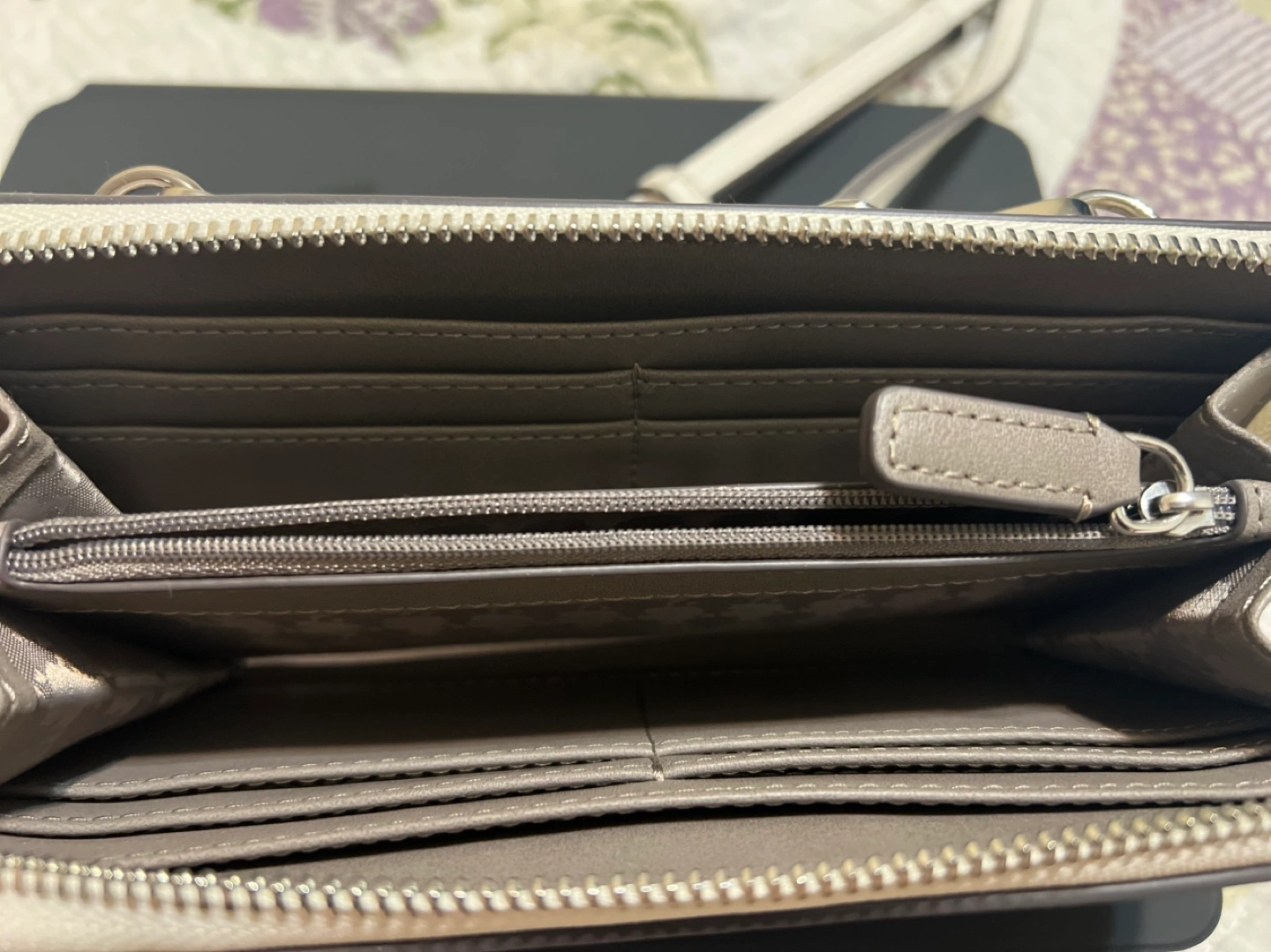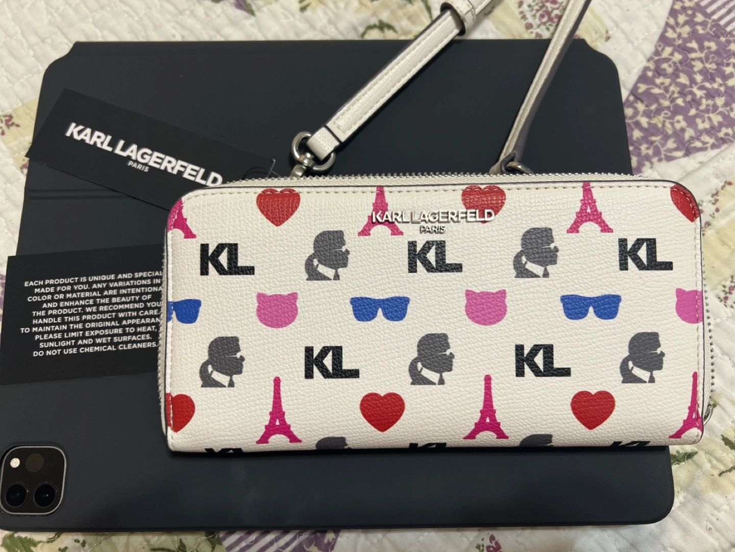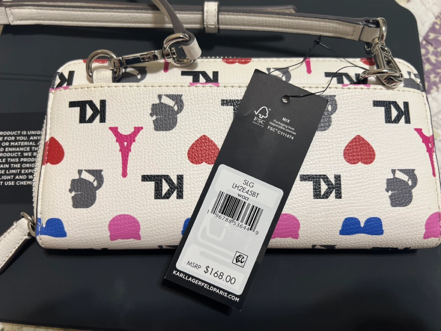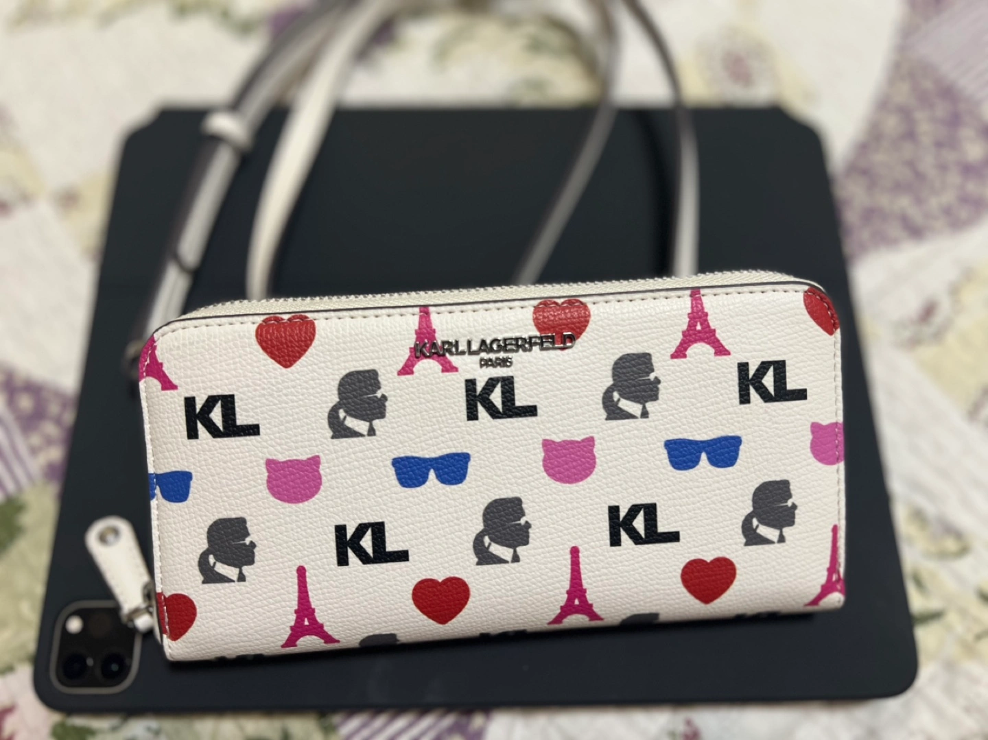 White wallet with a crossbody strap. Features a repeating pattern of various colourful images including Karl Lagerfeld's silhouette, hearts, sunglasses, a cat, and the Eiffel Tower.