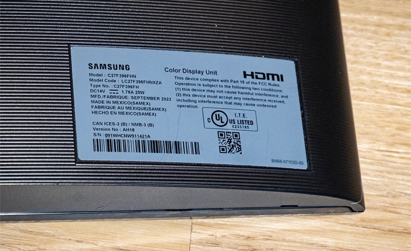 This is a Samsung C27F396FHN 27-inch curved monitor. It's a color display unit with HDMI input. It was manufactured in September 2023 and runs on 14V with 25W power. Includes an adjustable monitor arm.