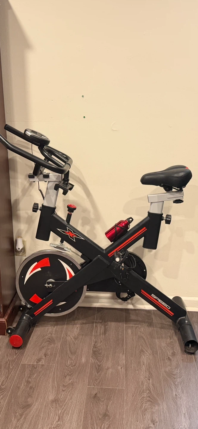 Black spin bike with red accents. It has adjustable seat and handlebars. Includes a water bottle cage. A great way to get a cardio workout at home! (If you're near my location, I can give you a free delivery)