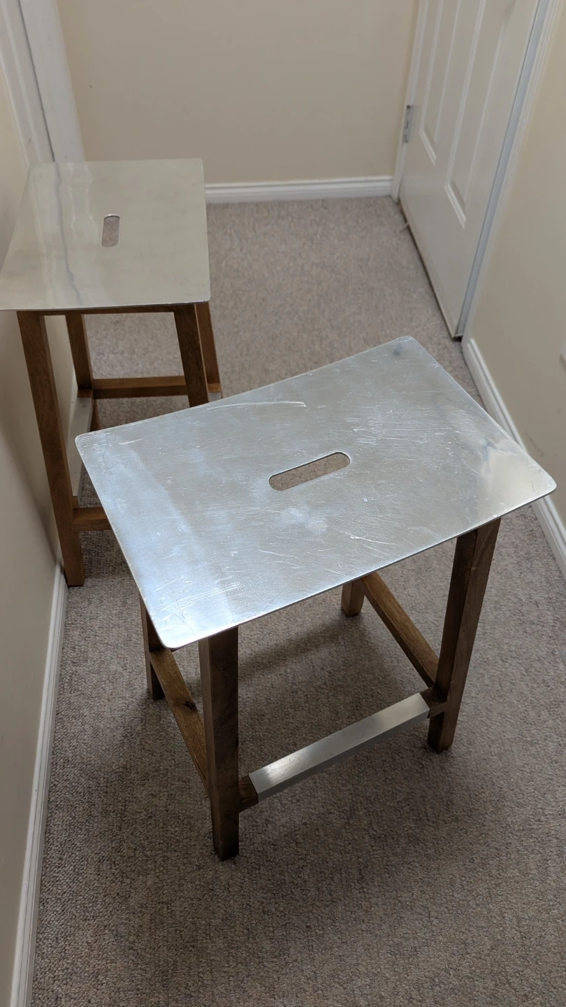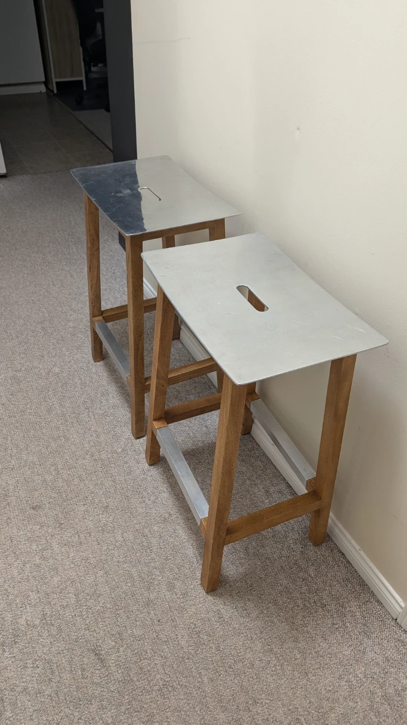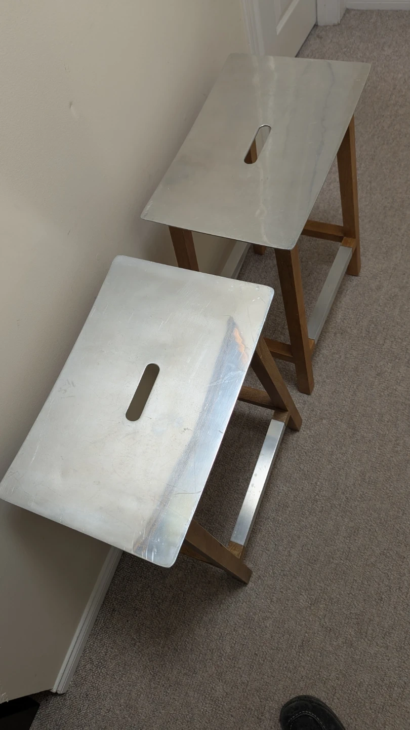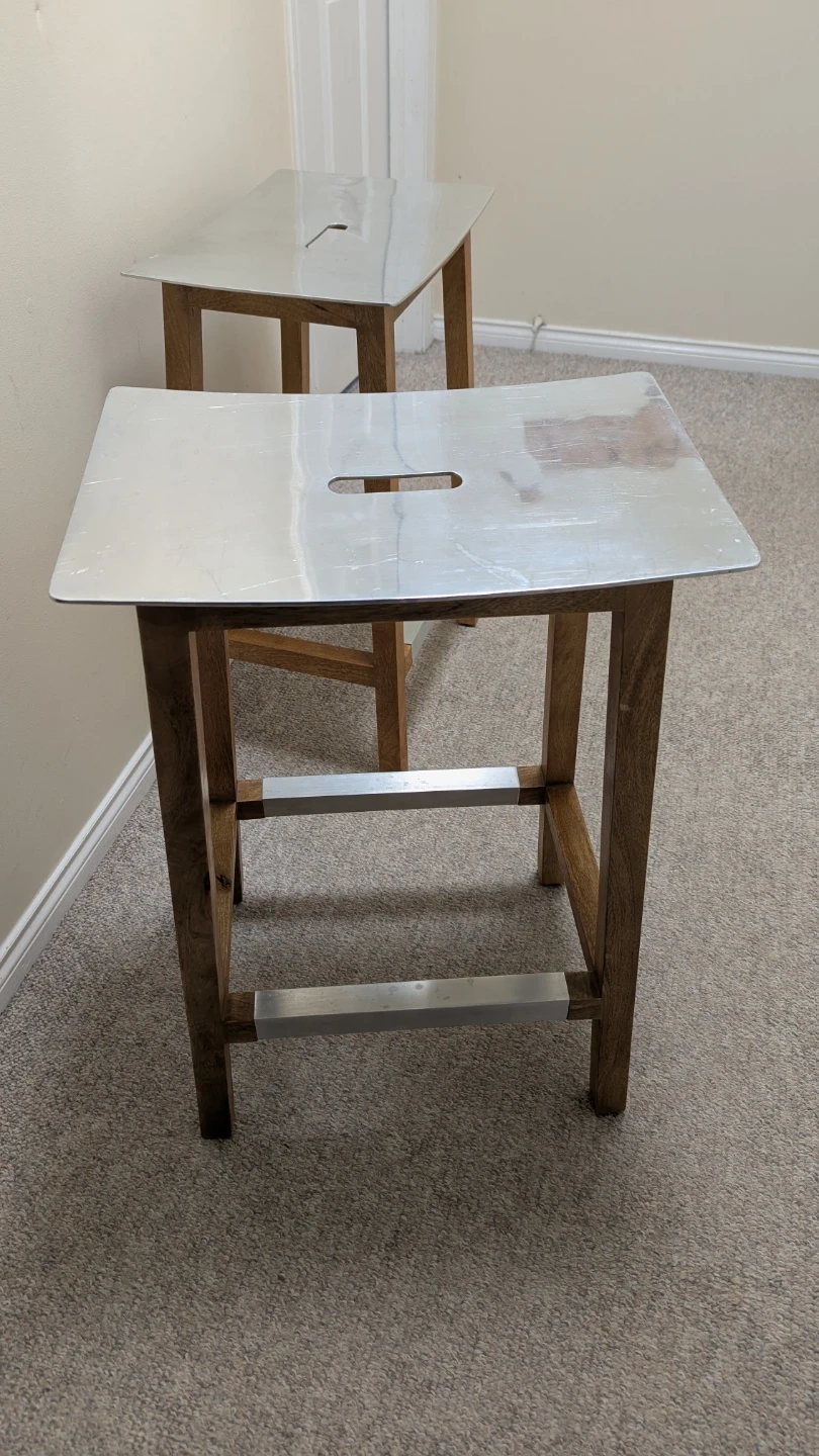 Good used condition. Some light surface scratches on the metal tops (shown in photos), but fully functional and sturdy.