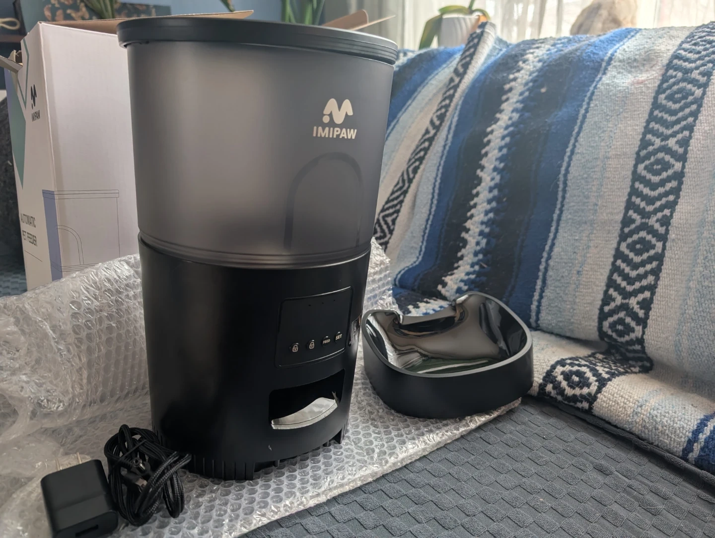 Brand new IMIPAW automatic pet feeder with a 3L capacity. It's suitable for cats and small or medium dogs. The feeder comes with a power adapter and is designed for portion-controlled feeding.