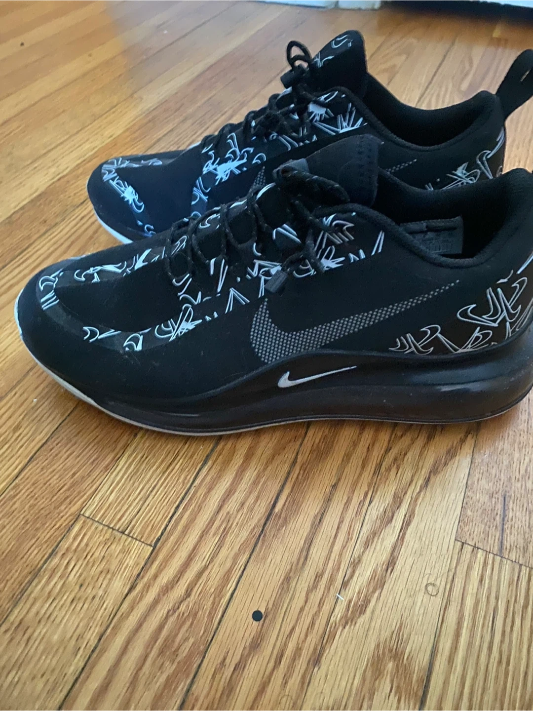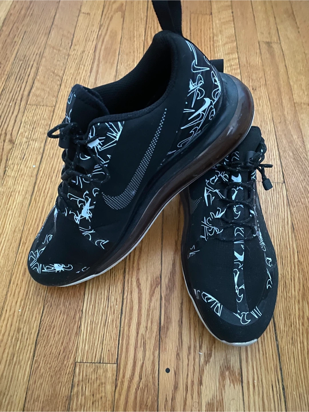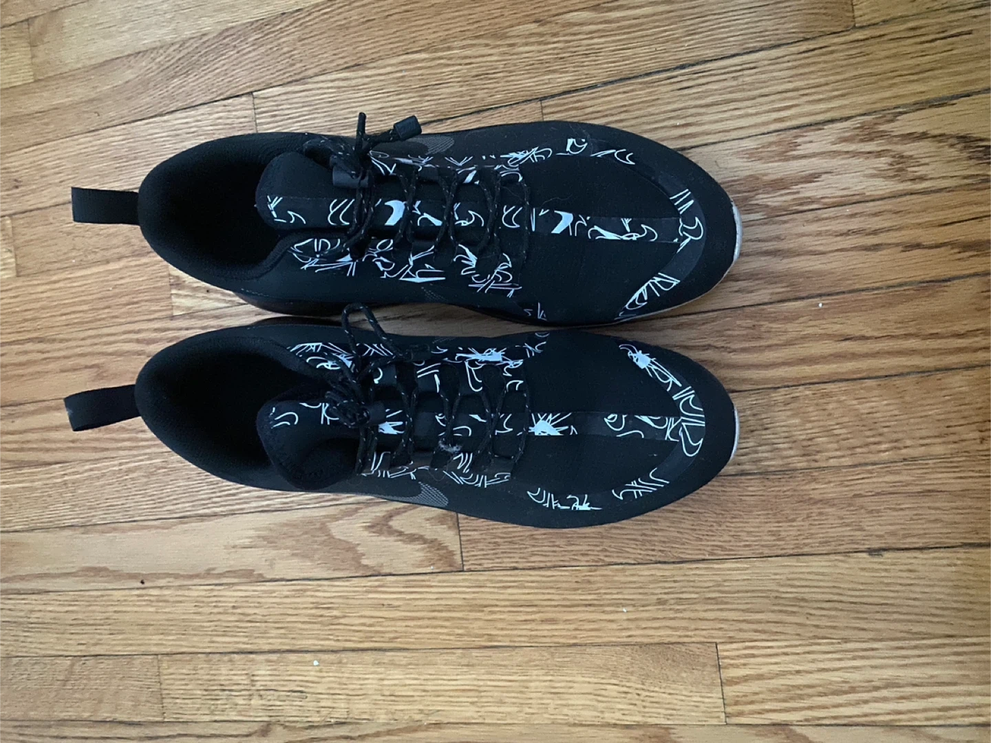 These Nike running shoes are black with a white abstract pattern. They feature laces and a pull tab at the heel. The sole is designed for athletic performance.