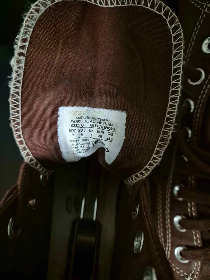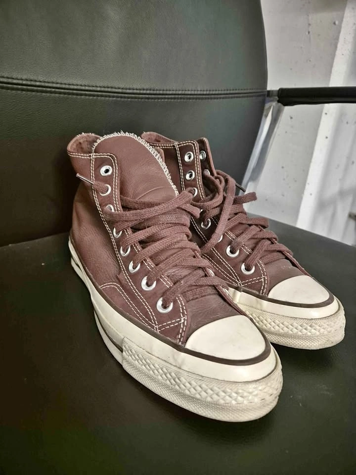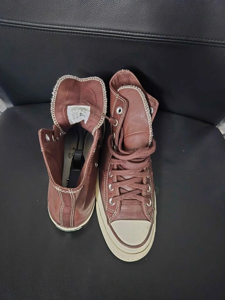 Converse Chuck 70 high-top sneakers in a brown or "barkroot" leather finish. Unisex Size 7 for Men, Size 9 for Women. EU 40. Pick up only.
