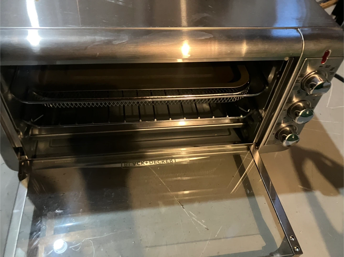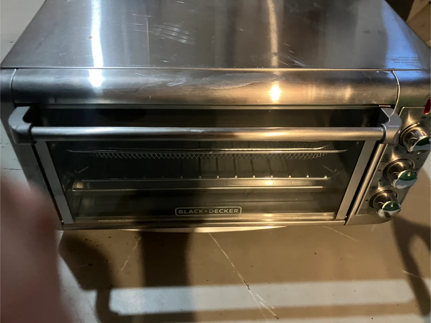 Stainless steel Black+Decker toaster oven with air fryer function. It's a versatile kitchen appliance for toasting, broiling, baking, and air frying. Includes a bake tray and air fry basket.