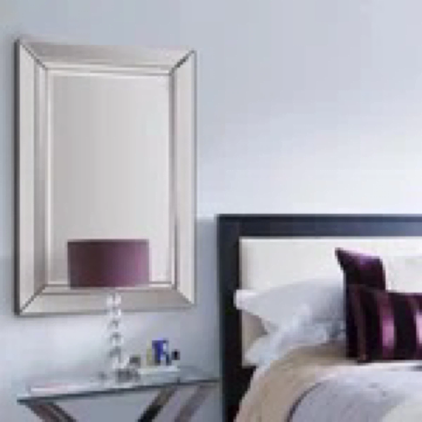 Rectangular wall mirror with a bevelled frame. It's a decorative piece for any room. Glass mirror with a silver-toned frame.