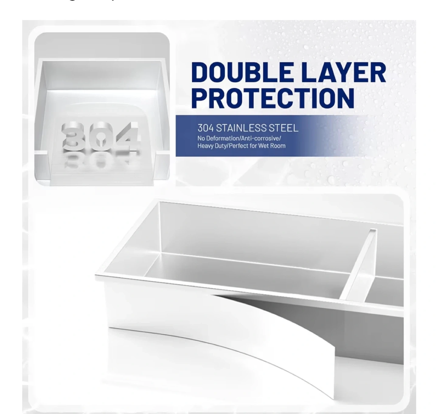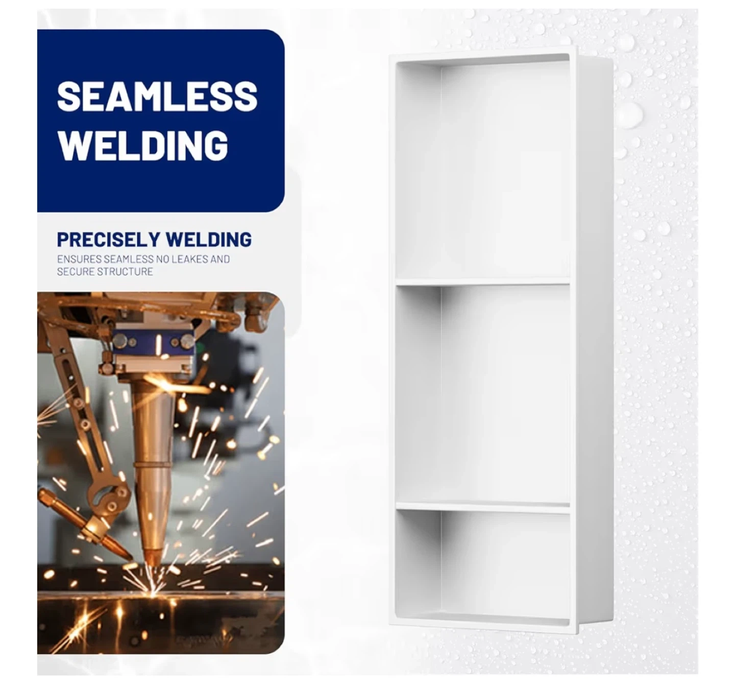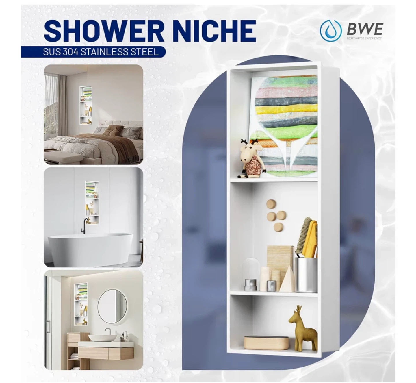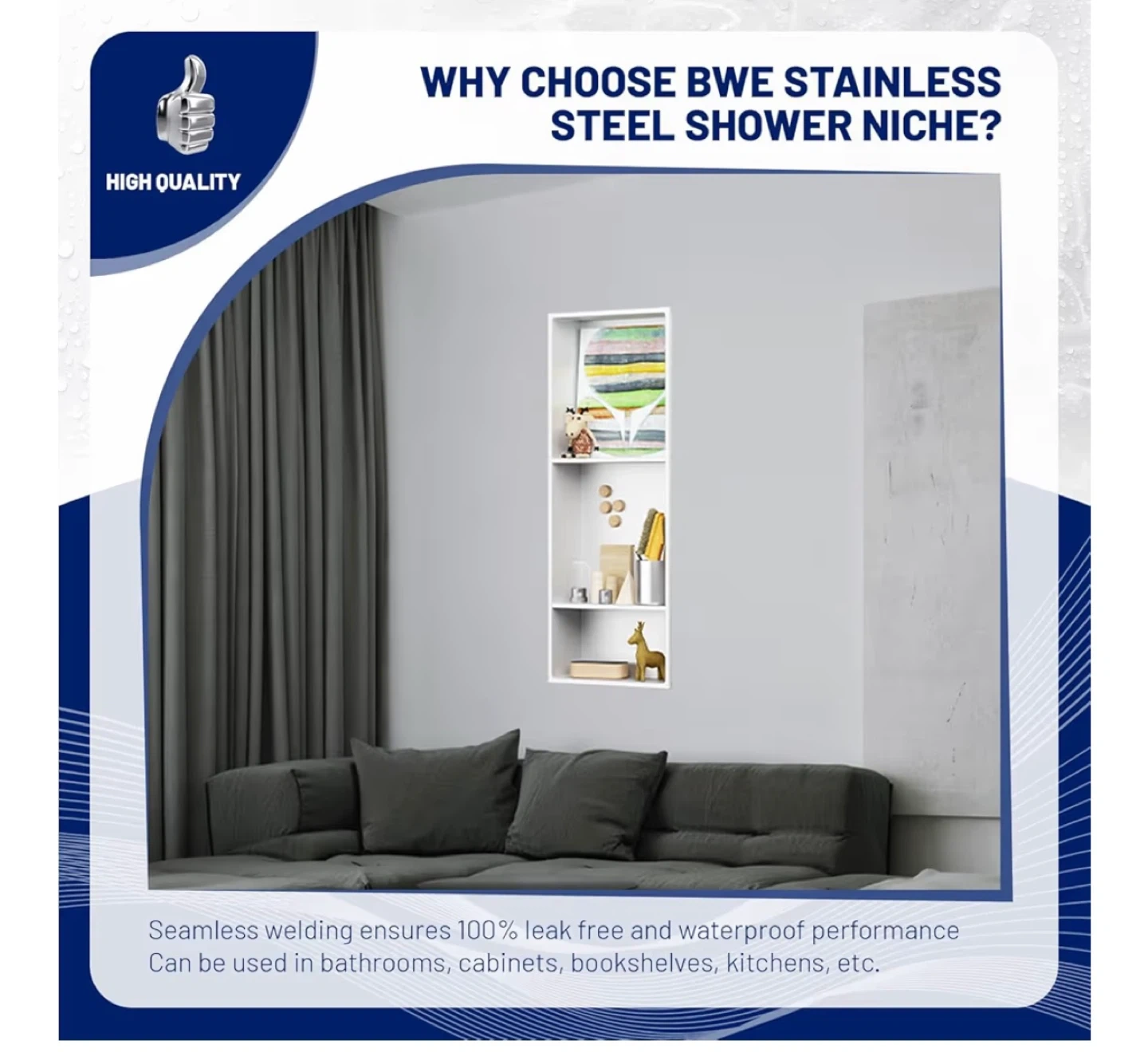 This BWE shower niche is constructed from SUS 304 stainless steel for durability. It features seamless welding ensuring leak-free and waterproof performance. It's suitable for bathrooms, cabinets, bookshelves, and kitchens.