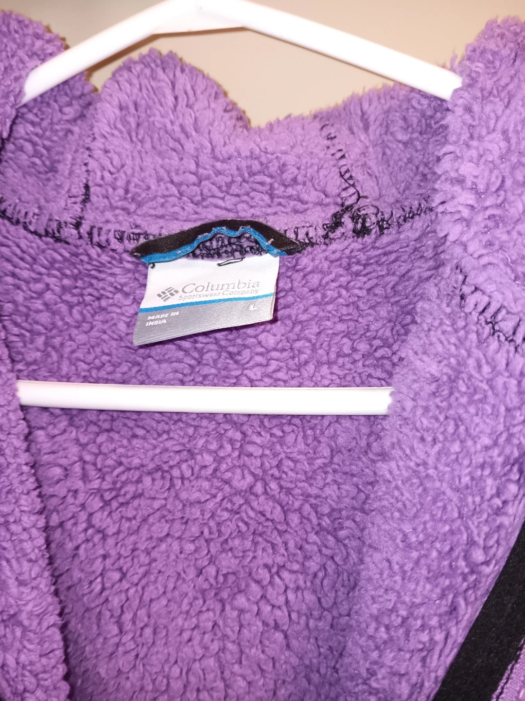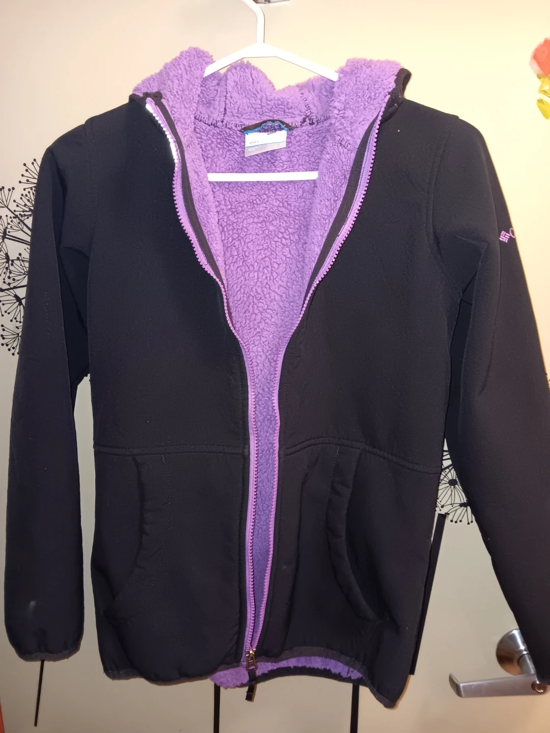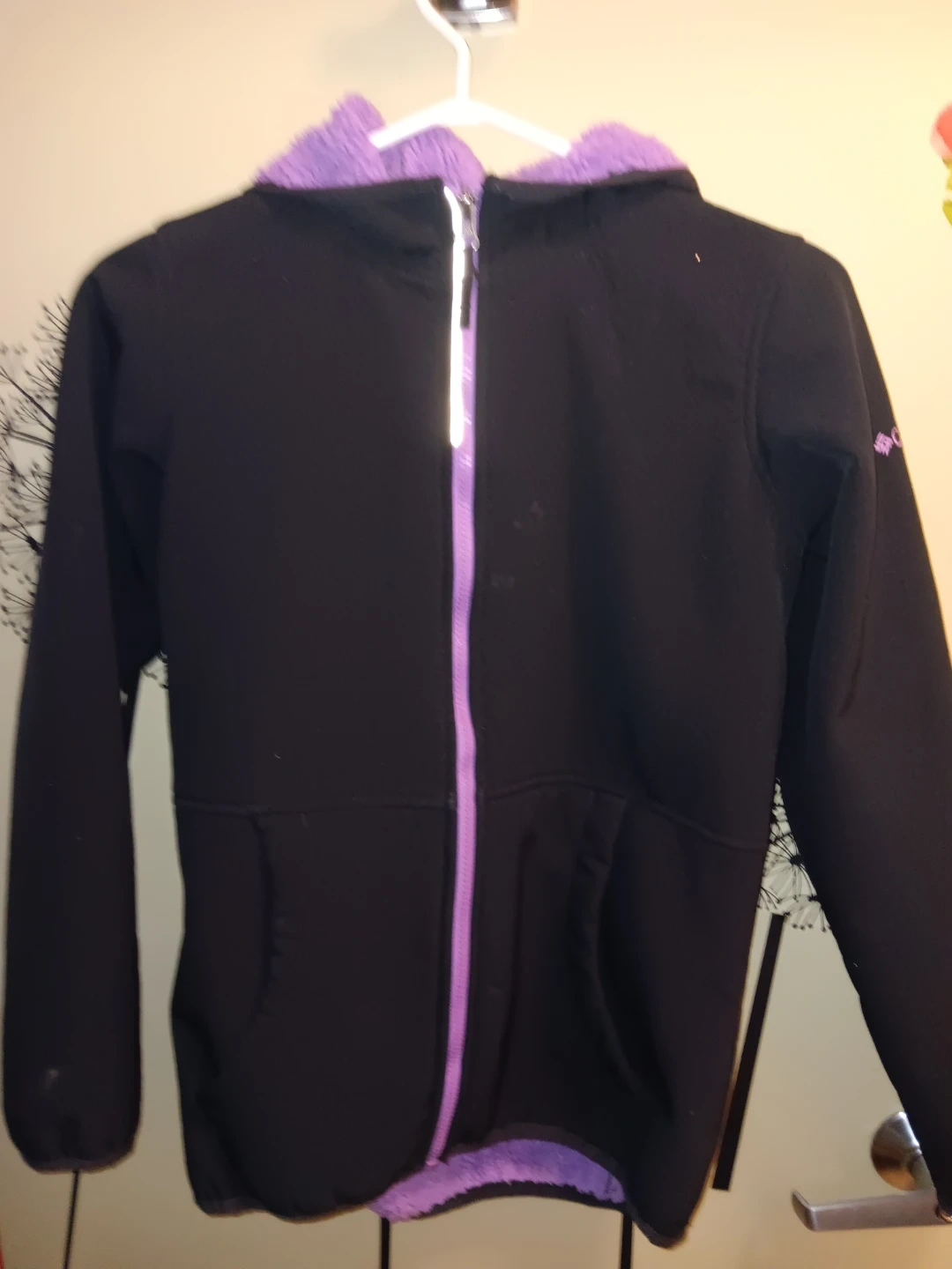 This Columbia hoodie is black with a bright purple fleece lining. It features a full zip front and a hood. Youth Size XL.