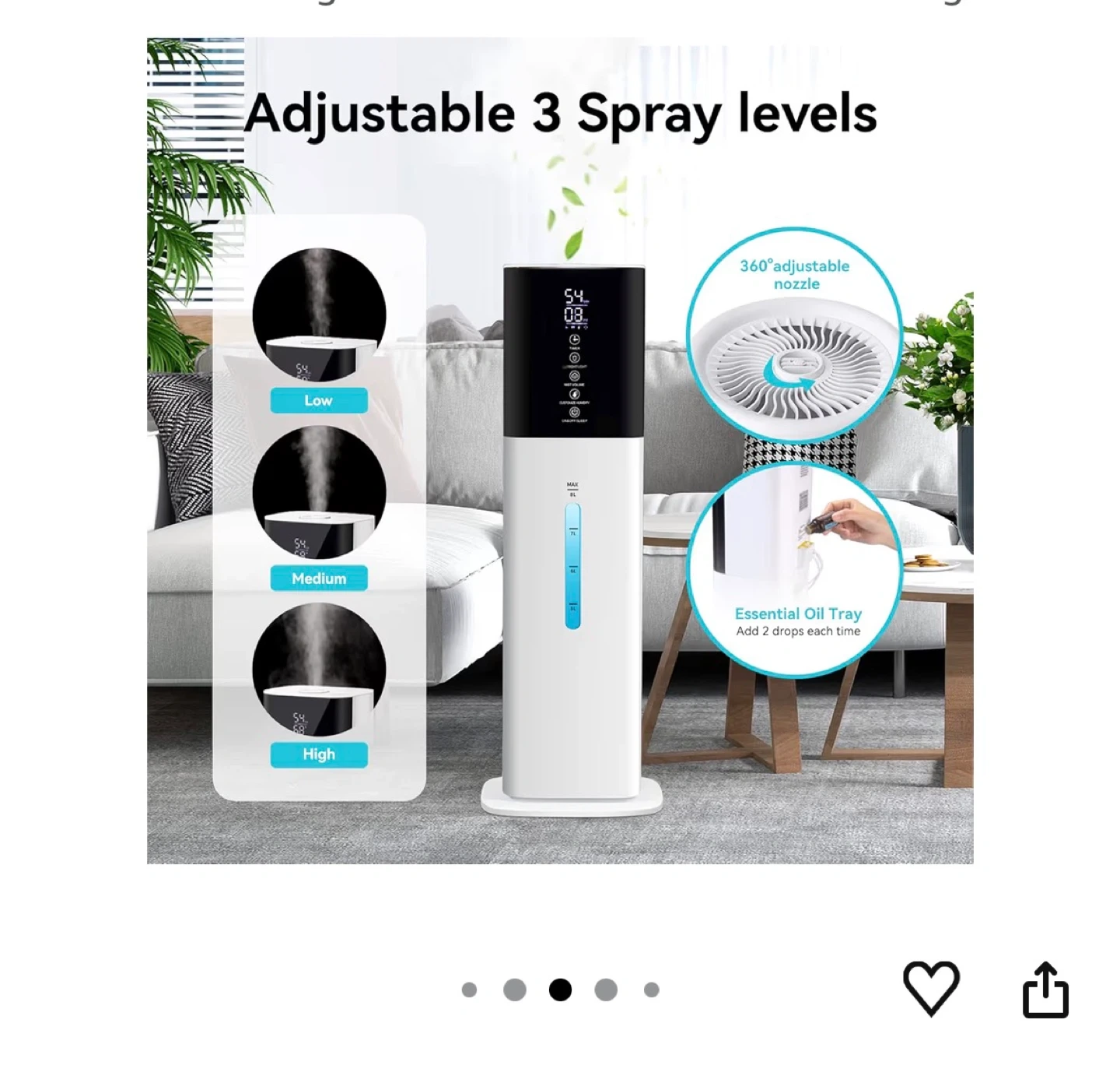 This large room humidifier has an 8L water tank and a run time of up to 30 hours. It features adjustable mist levels, a 7-colour night light, and a touch/remote control. It also has an auto shut-off protection and a sleep mode. An essential oil tray is included for adding scents.