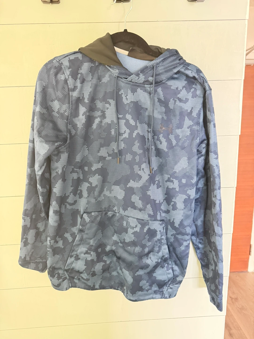 This Under Armour hoodie features a cool camouflage pattern. It has a comfortable hood and a front kangaroo pocket. Great for staying warm during outdoor activities!