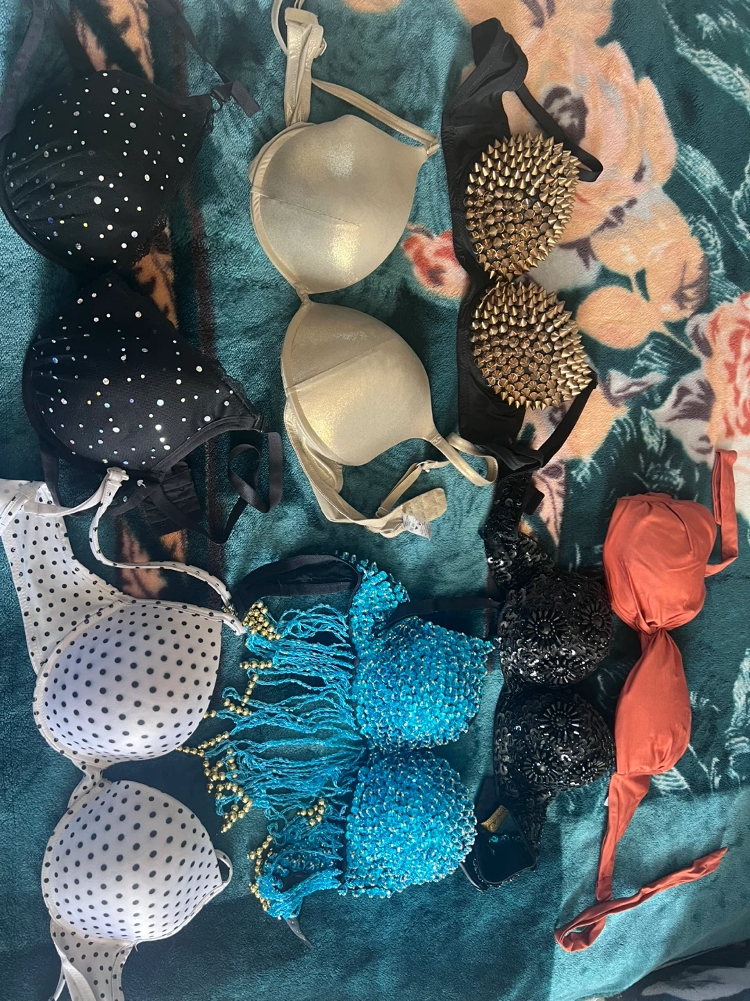 A collection of various women's bras in different styles and colours. Includes black, white polka dot, blue beaded, and metallic gold bras. Some bras feature unique embellishments like sequins and spikes. Straps are adjustable on most items. Let me now which one do you like and I can send you photos.