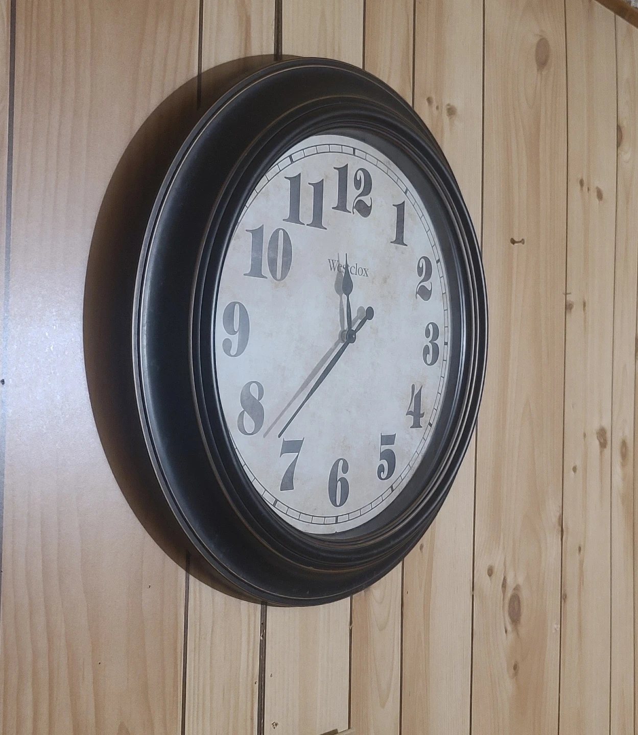 This is a Westclox wall clock. It has large, easy-to-read numbers and a dark frame. It's perfect for any room in your house!