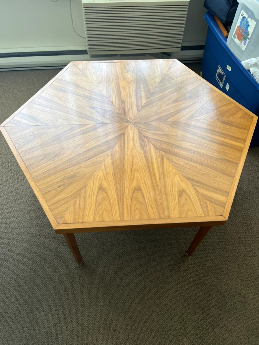 A stylish hexagonal coffee table with a beautiful walnut wood grain pattern. It's made with a light walnut wood finish and has six sturdy legs.